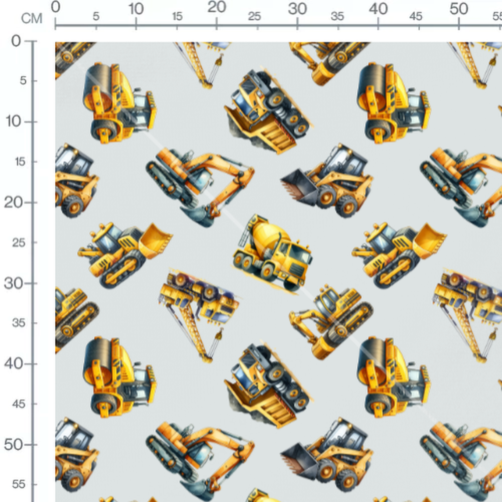 Engins de chantier jaunes et gris sur fond blanc. Les tissus