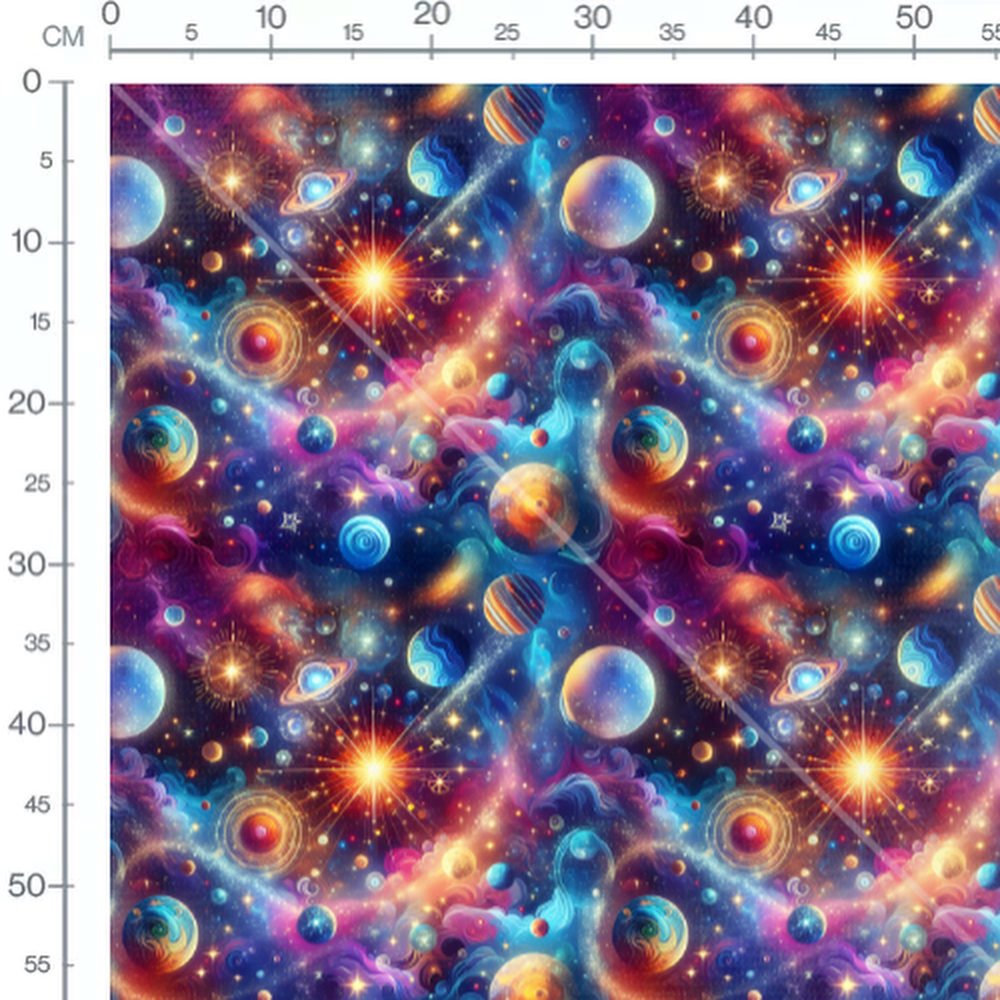 Planètes multicolores, étoiles brillantes et nébuleuses colorées sur fond spatial violet et bleu. Spirales et éclats lumineux dans des tons orange, rose et bleu. Les tissus