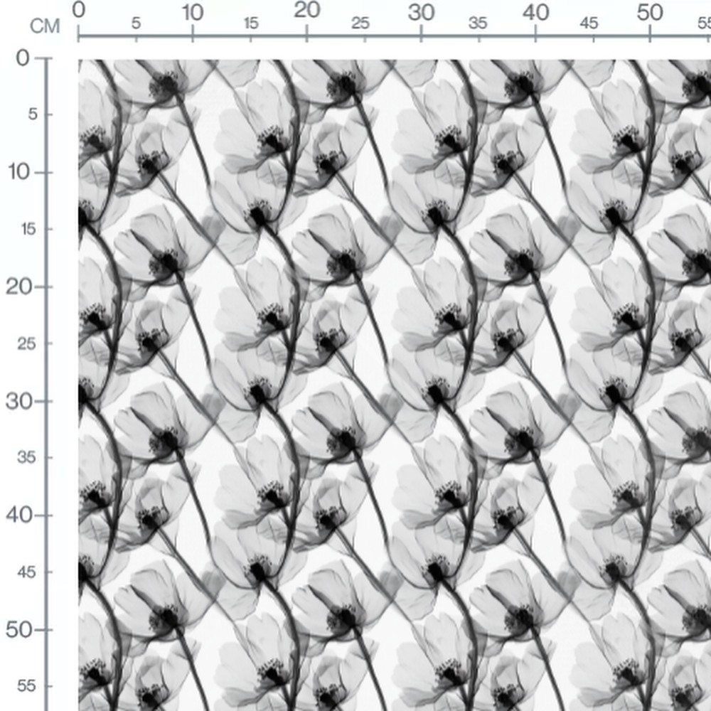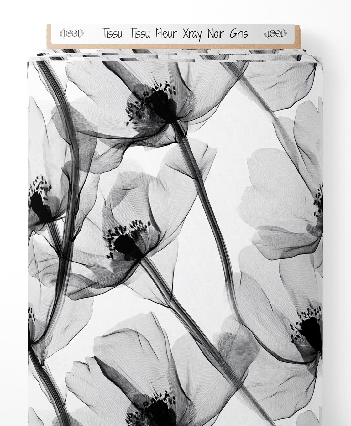 Fleurs translucides noir et gris sur fond blanc. Petits détails en noir au centre des fleurs. Les tissus