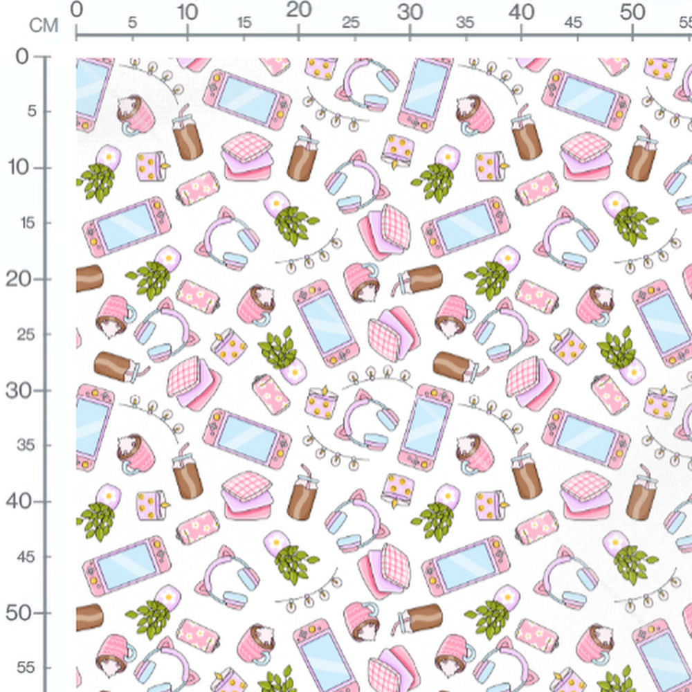 Casques roses, téléphones portables bleus, plantes vertes, tasses de café marron, et petits accessoires sur fond quadrillé blanc. Les tissus