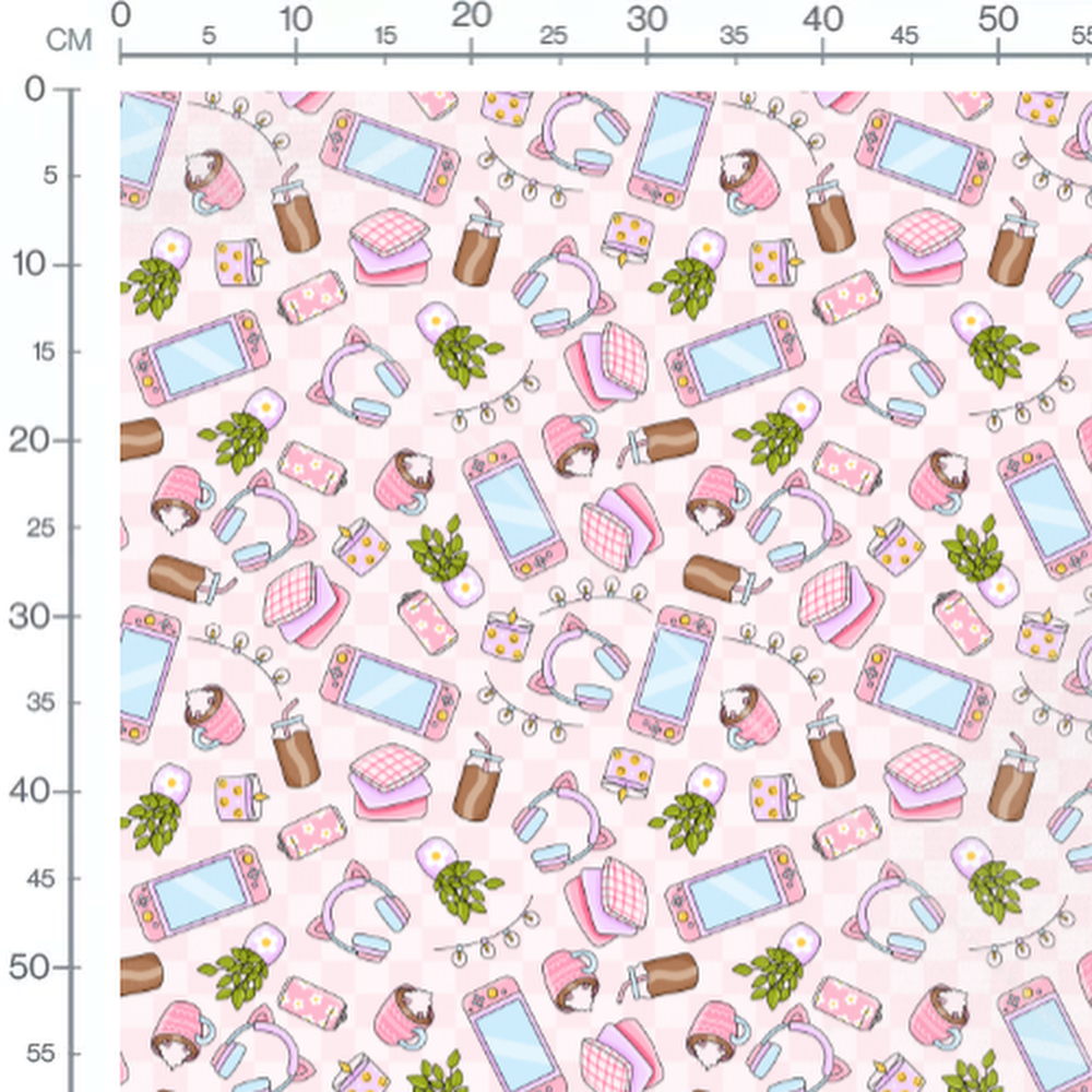 Casques, consoles de jeu, boissons, plantes, et petits gâteaux aux couleurs rose, bleu et marron sur fond à carreaux rose clair. Éléments de décoration et accessoires avec motifs floraux et lignes noires. Les tissus