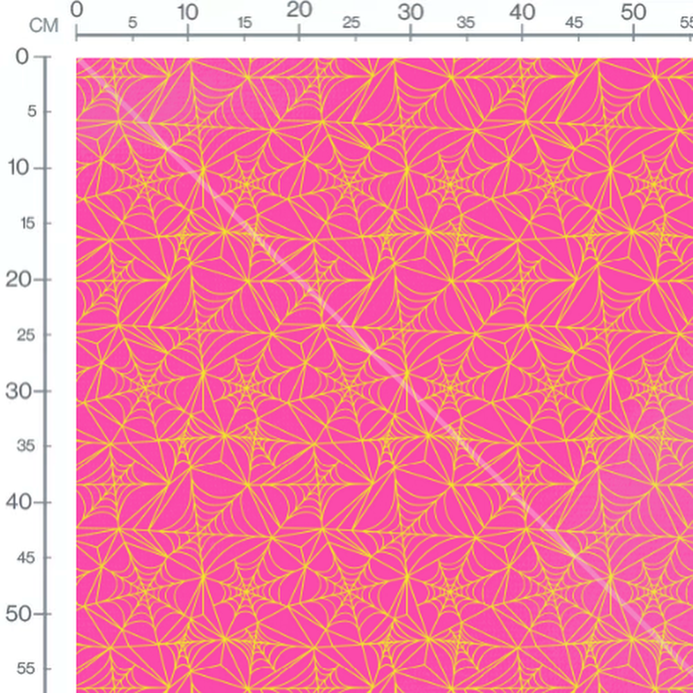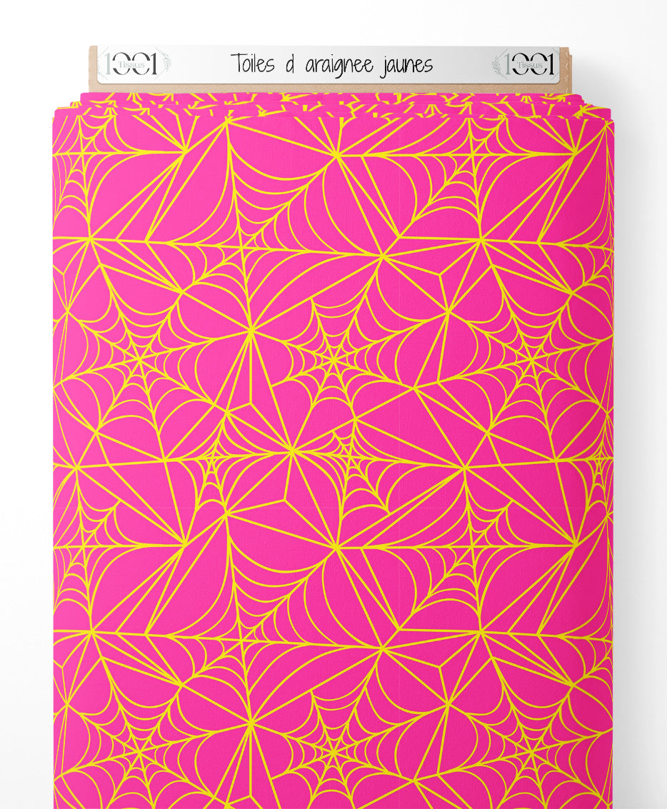 Les toiles d'araignée sont dessinées avec des lignes fines et régulières. Le fond rose vif contraste avec les lignes jaunes éclatantes.Les tissus