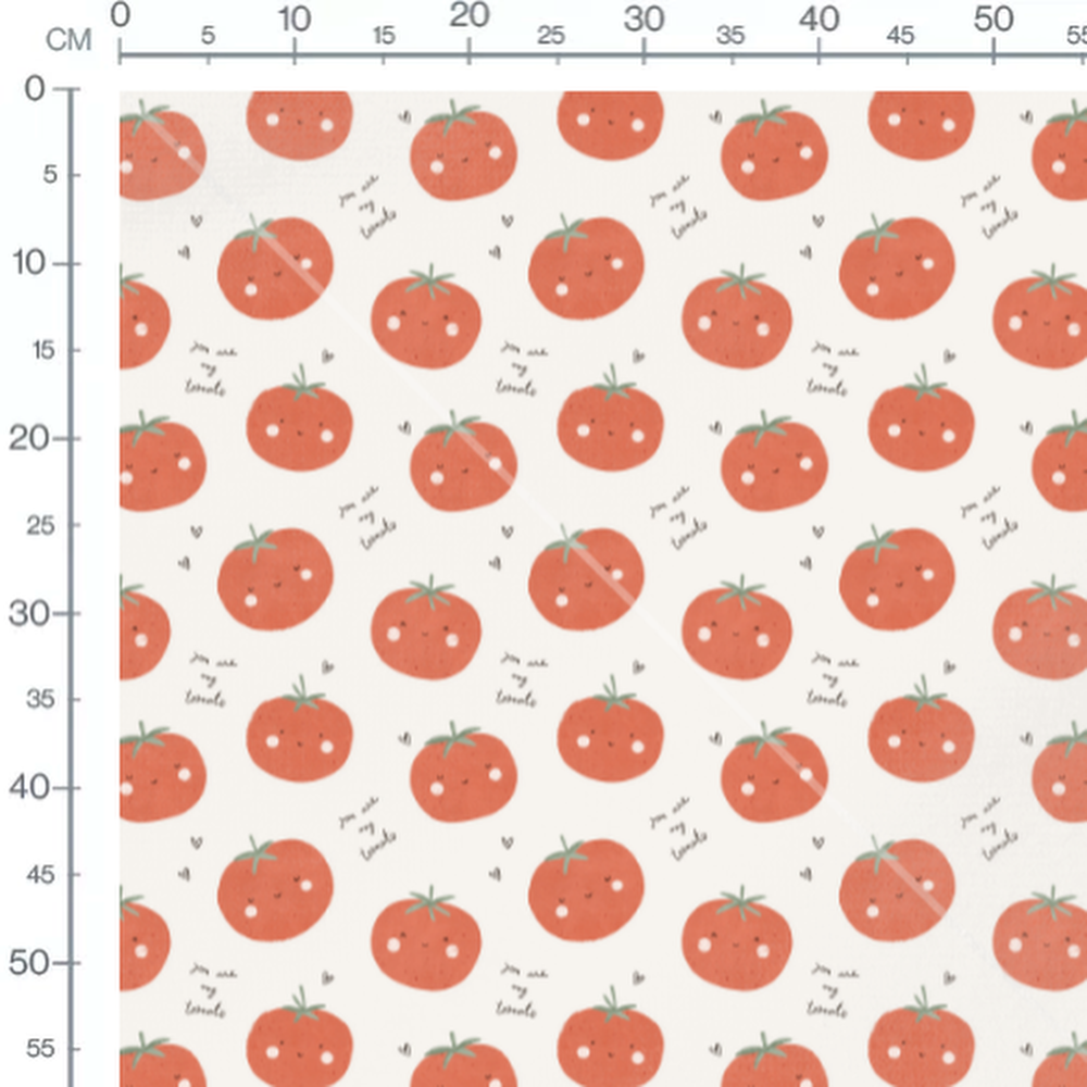 Les tomates rouges affichent des visages souriants avec des joues roses. Des petits cœurs noirs et l'inscription 'you are my tomato' ajoutent une touche ludique.Les tissus