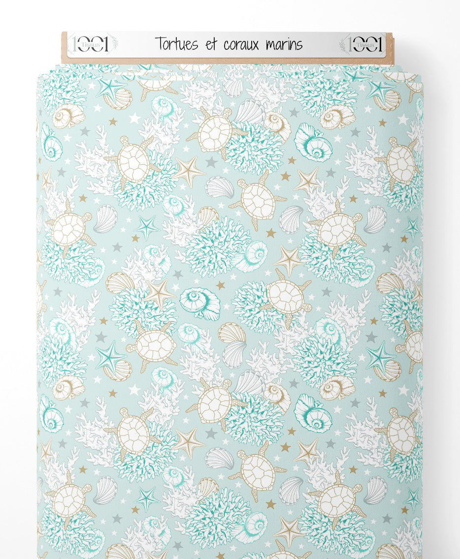 Les tortues beige se mêlent aux coraux turquoise. Des coquillages et étoiles de mer beige et turquoise complètent le motif marin. Le fond bleu clair évoque une ambiance océanique.Les tissus