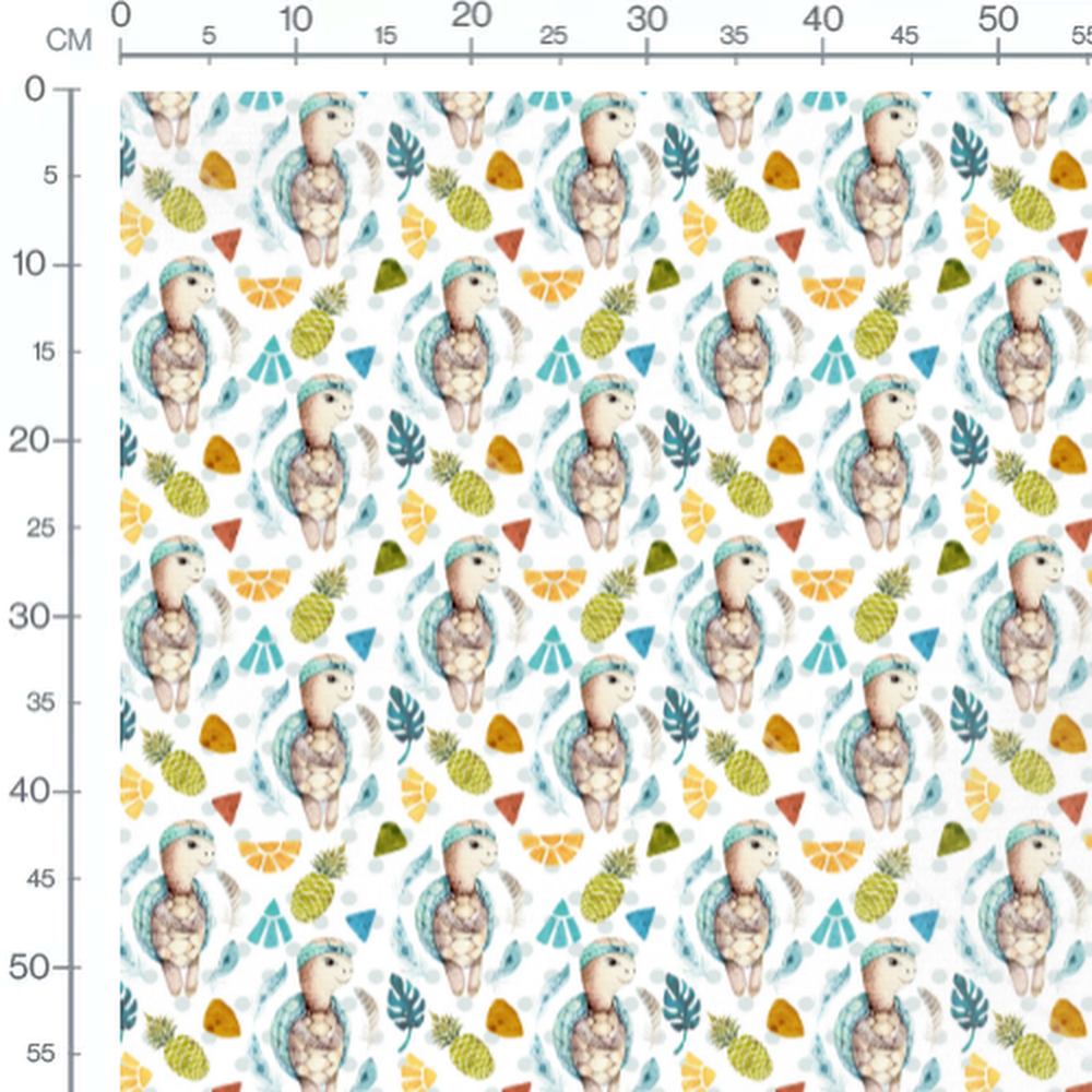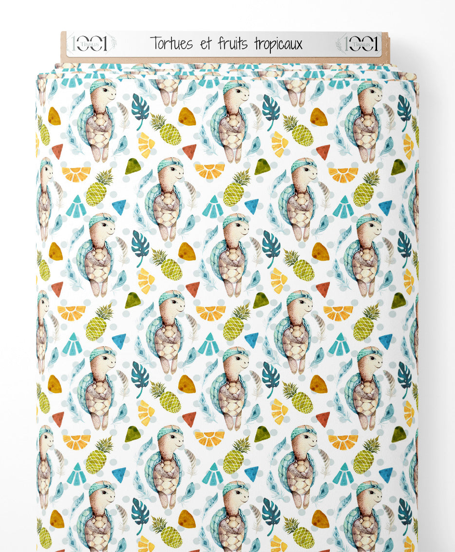 Les tortues sont accompagnées de tranches d'agrumes et de feuilles tropicales. Des formes triangulaires et des ananas ajoutent une touche colorée. Les couleurs incluent du bleu, du vert, du jaune et de l'orange.Les tissus