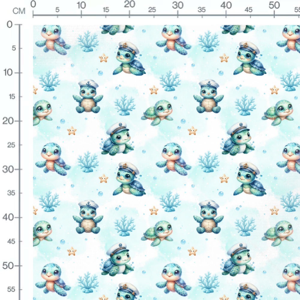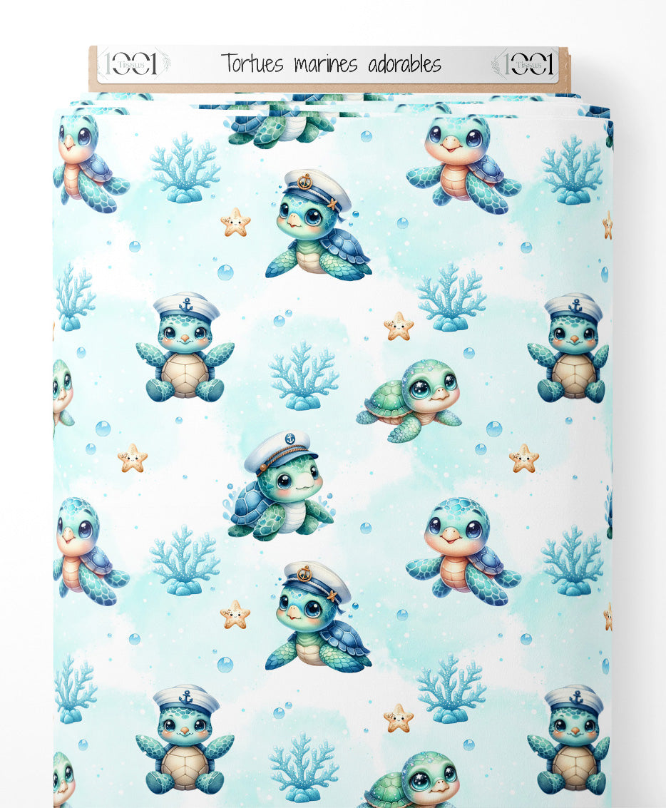 Les tortues portent des chapeaux de marin blancs avec des détails bleus. Les coraux sont de couleur bleu pâle et les étoiles de mer sont beige clair. De petites bulles bleues sont dispersées sur le fond.Les tissus
