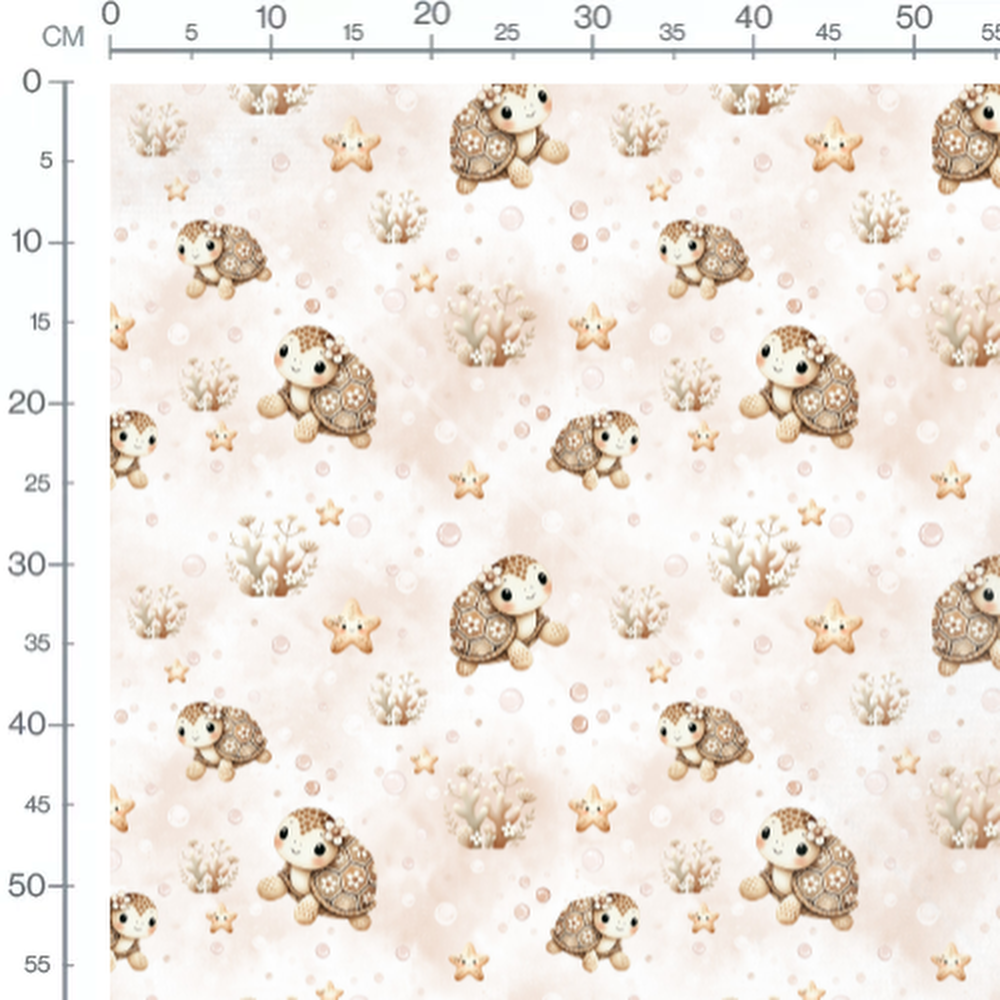 Les tortues ont des motifs floraux sur leurs carapaces. Les étoiles de mer sont dispersées parmi les coraux délicats. Les bulles ajoutent une touche de légèreté au design.Les tissus