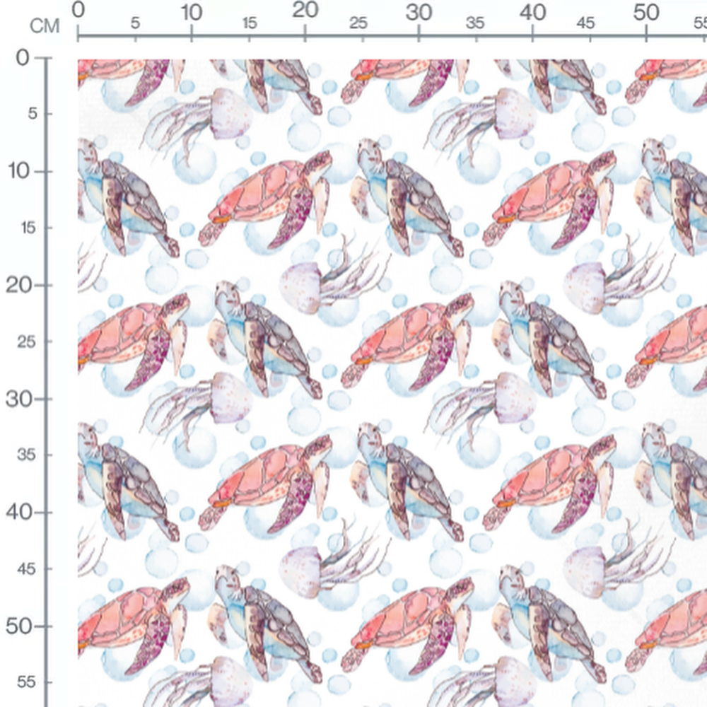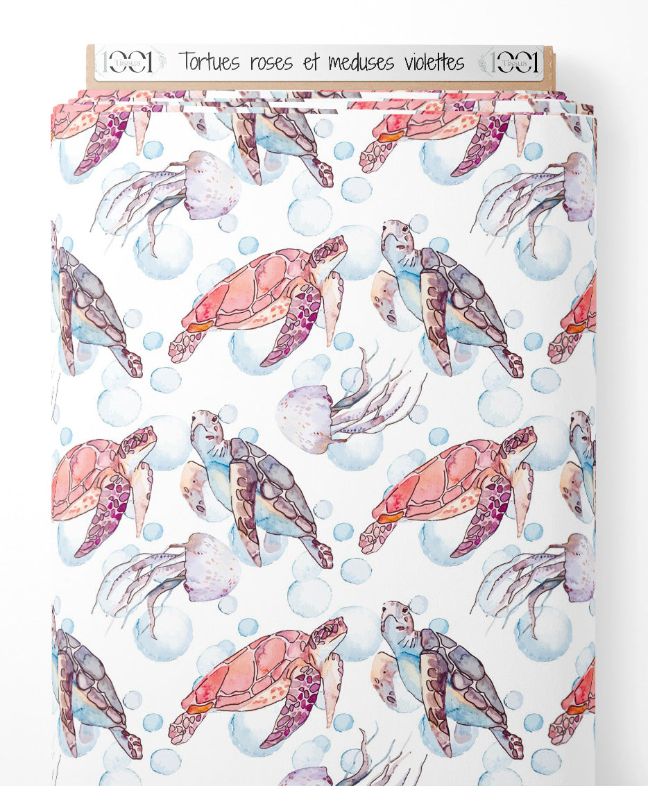Les tortues sont dessinées avec des teintes de rose et de brun. Les méduses présentent des nuances de violet et de bleu. Les bulles ajoutent une touche aquatique au motif.Les tissus