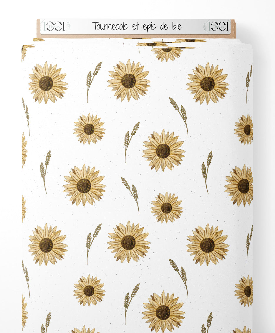 Les tournesols ont des pétales jaunes et un centre brun foncé. Les épis de blé sont de couleur beige et ajoutent une touche champêtre.Les tissus