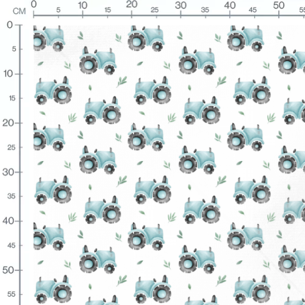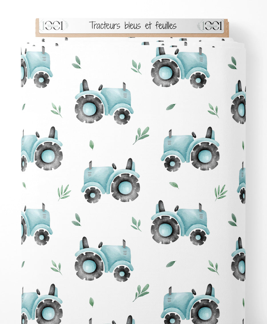 Les tracteurs sont de couleur bleu clair avec des détails noirs. Les feuilles vertes ajoutent une touche naturelle au motif.Les tissus