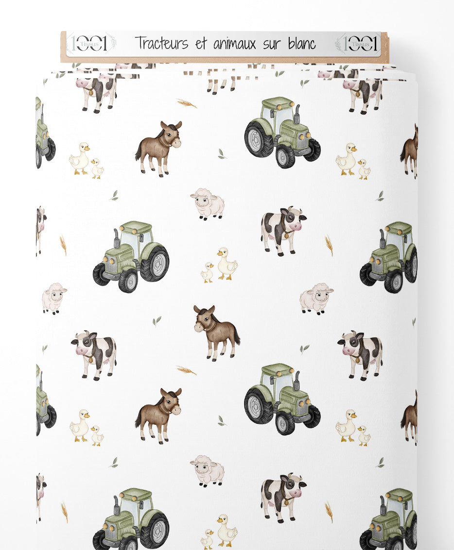 Les tracteurs sont de couleur verte avec des détails gris. Les ânes sont bruns, les moutons sont blancs, et les vaches sont noires et blanches. Les canards sont jaunes avec des becs orange. De petites feuilles vertes et des épis de blé dorés complètent le motif.Les tissus