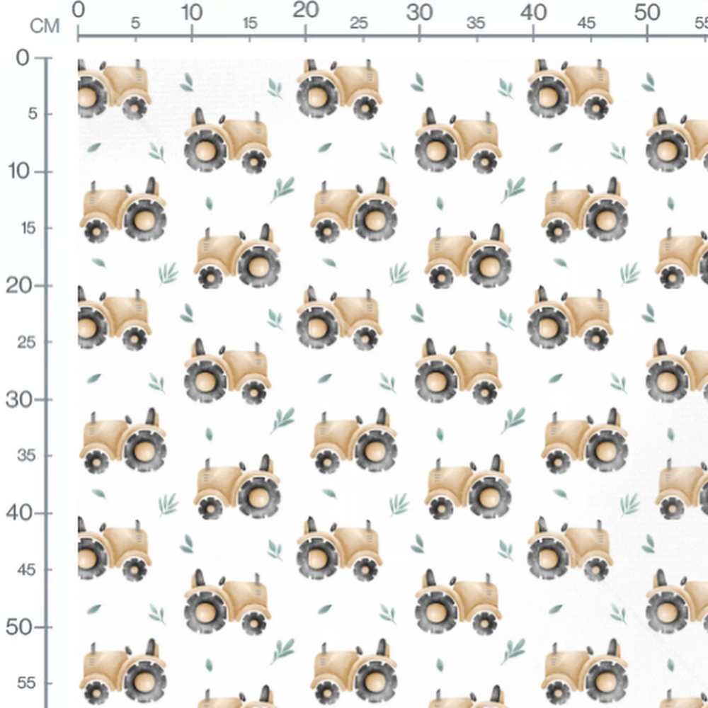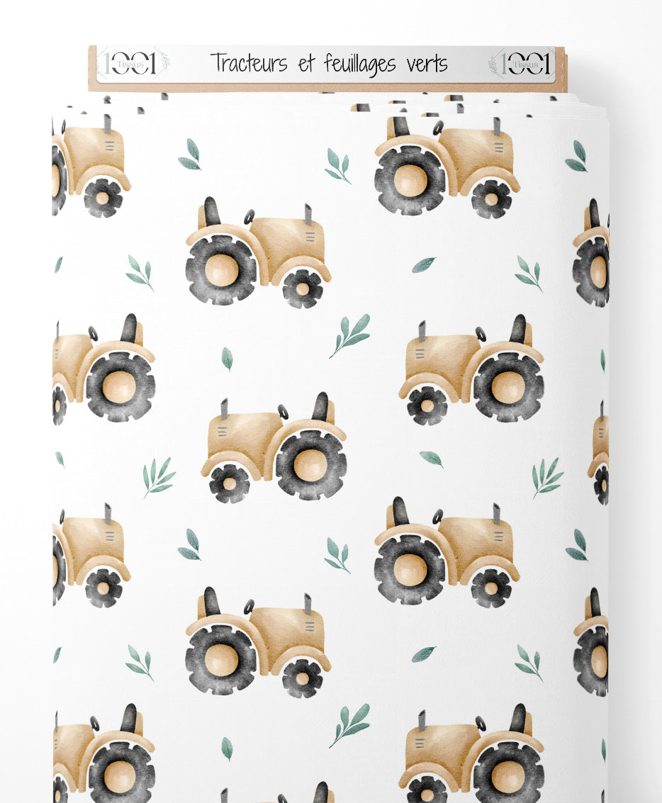 Les tracteurs sont dessinés dans des tons beiges avec des roues grises. De petits feuillages verts ajoutent une touche naturelle au motif.Les tissus