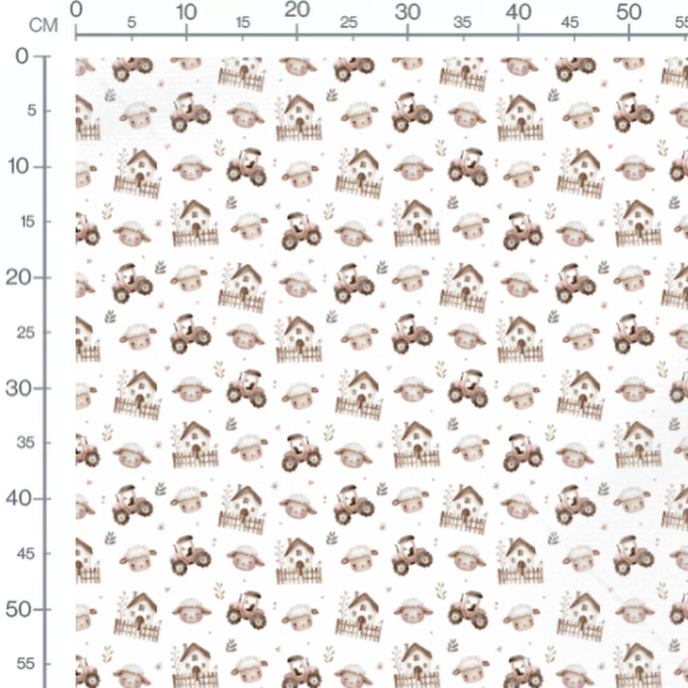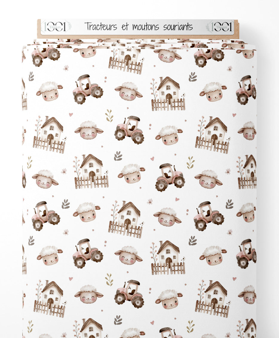 Les moutons ont des visages adorables et sont entourés de tracteurs marron. Les maisons sont accompagnées de petites clôtures et de motifs floraux délicats. De petits cœurs roses ajoutent une touche de douceur au motif.Les tissus