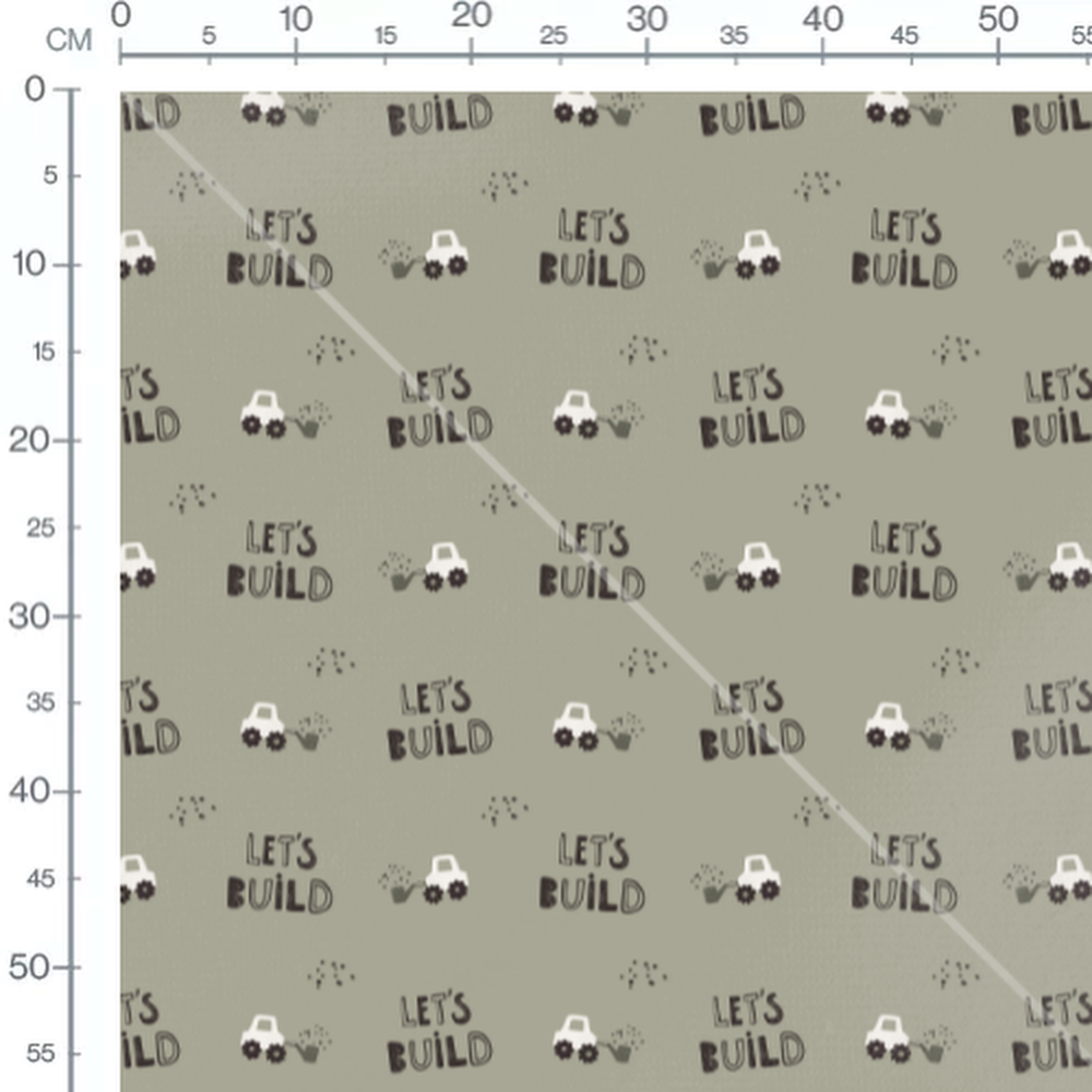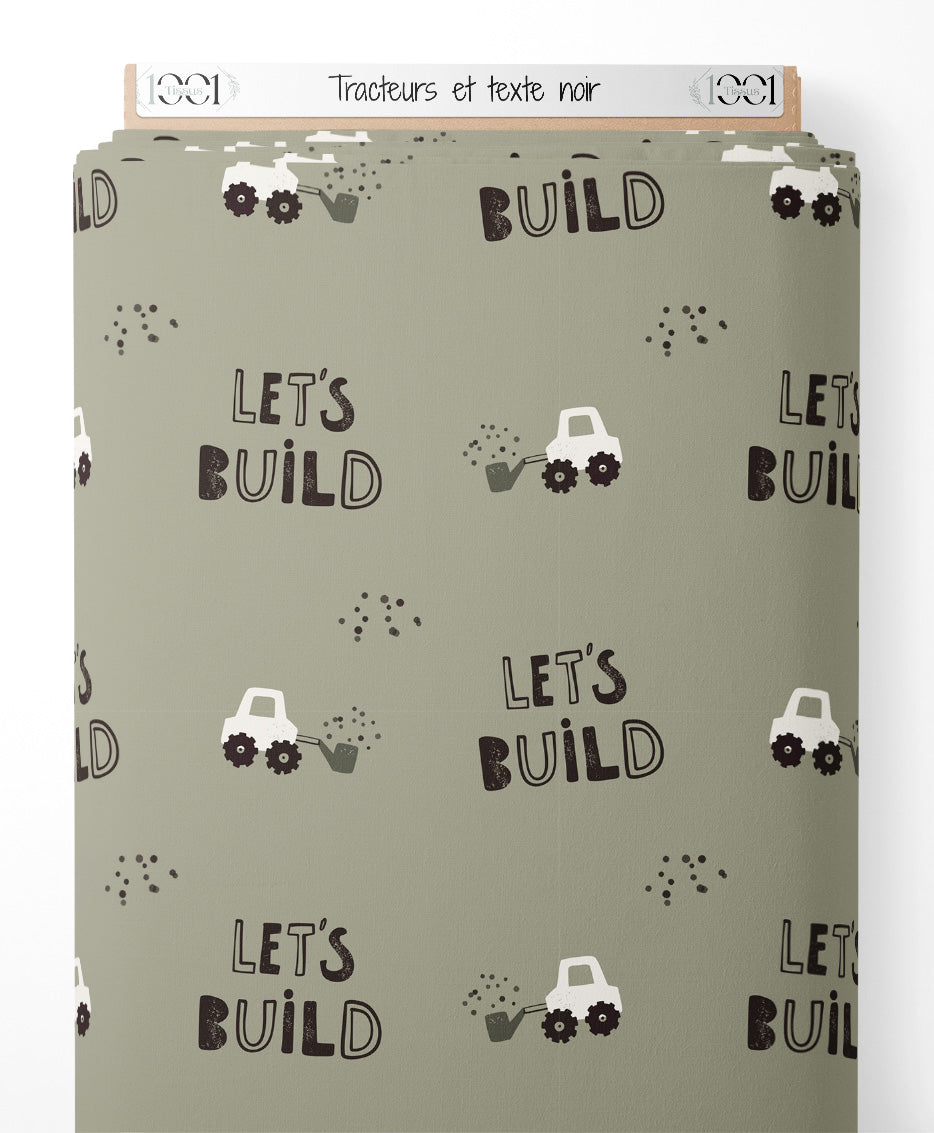 Les tracteurs sont accompagnés de petits points noirs imitant des gravillons. Le texte 'LET'S BUILD' est répété entre les motifs de tracteurs.Les tissus