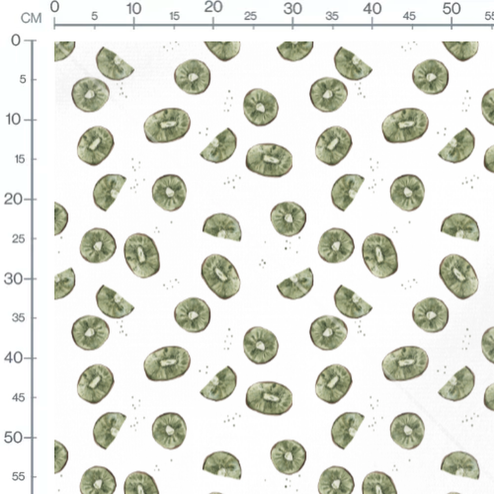 Les tranches de kiwis sont détaillées avec des nuances de vert. Les graines noires ajoutent un contraste subtil au motif. Chaque tranche montre le cœur blanc caractéristique du kiwi.Les tissus