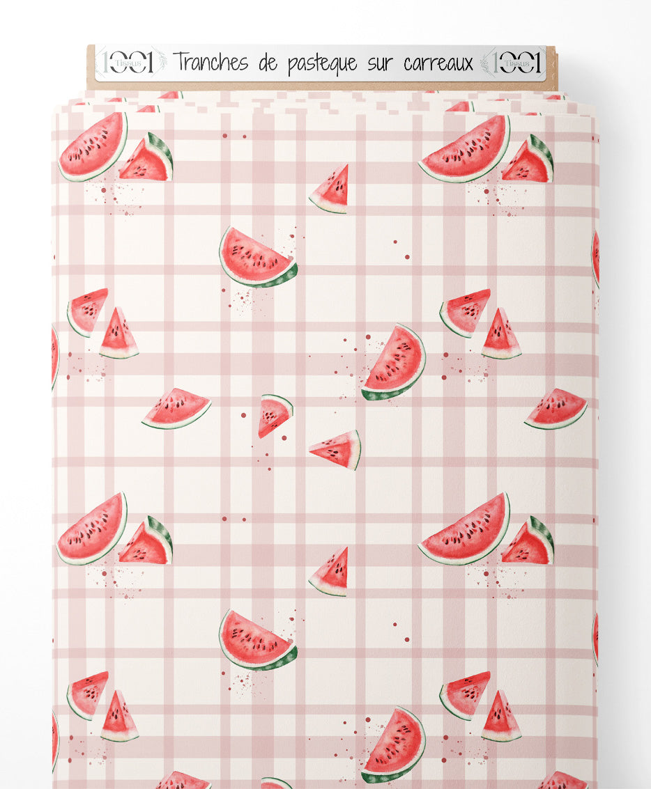 Les tranches de pastèque sont de différentes tailles et orientations. Le fond à carreaux roses ajoute une touche graphique au motif. Les éclaboussures de jus accentuent l'effet réaliste des fruits.Les tissus