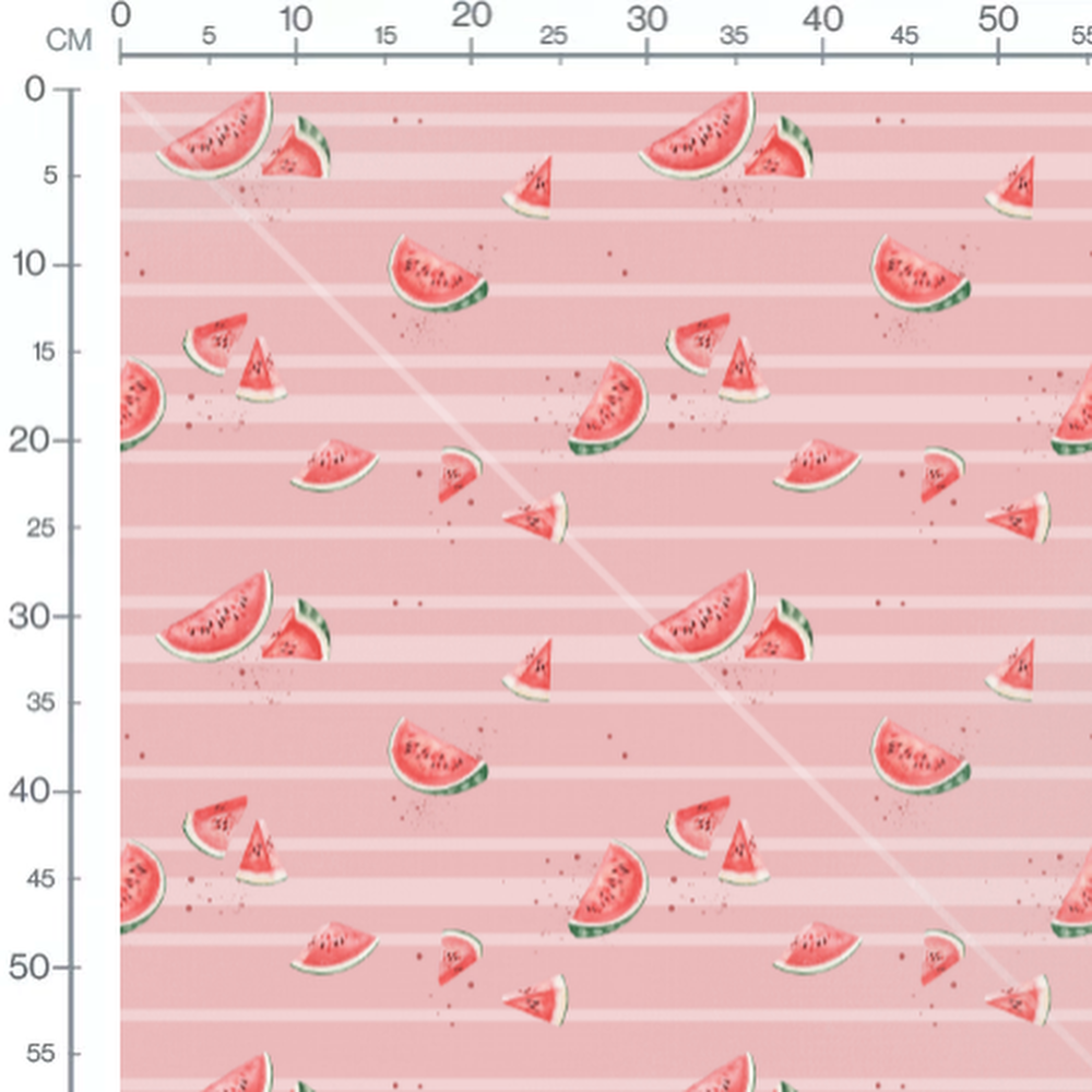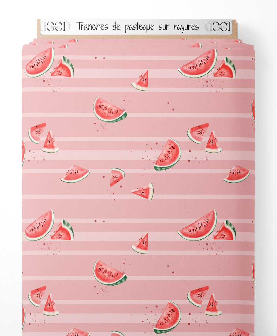 Les tranches de pastèque sont de différentes tailles et formes. Le fond est composé de rayures horizontales roses. Des éclaboussures autour des tranches ajoutent un effet dynamique.Les tissus