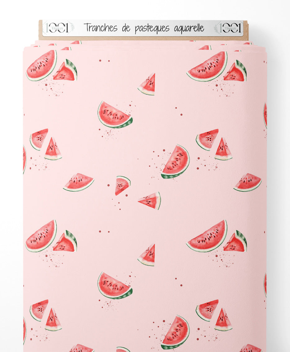 Les tranches de pastèques sont dispersées avec des éclaboussures subtiles. Chaque tranche montre une écorce verte et des pépins noirs distincts.Les tissus