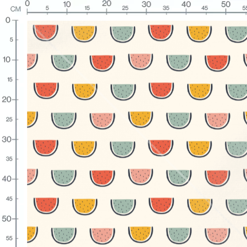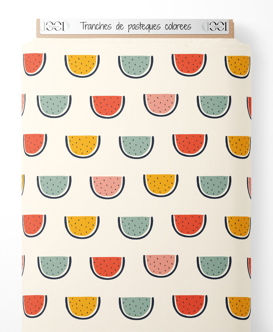 Les tranches de pastèques sont stylisées avec des couleurs vives. Les graines noires ajoutent un contraste sur chaque tranche. Le fond crème met en valeur les couleurs des fruits.Les tissus