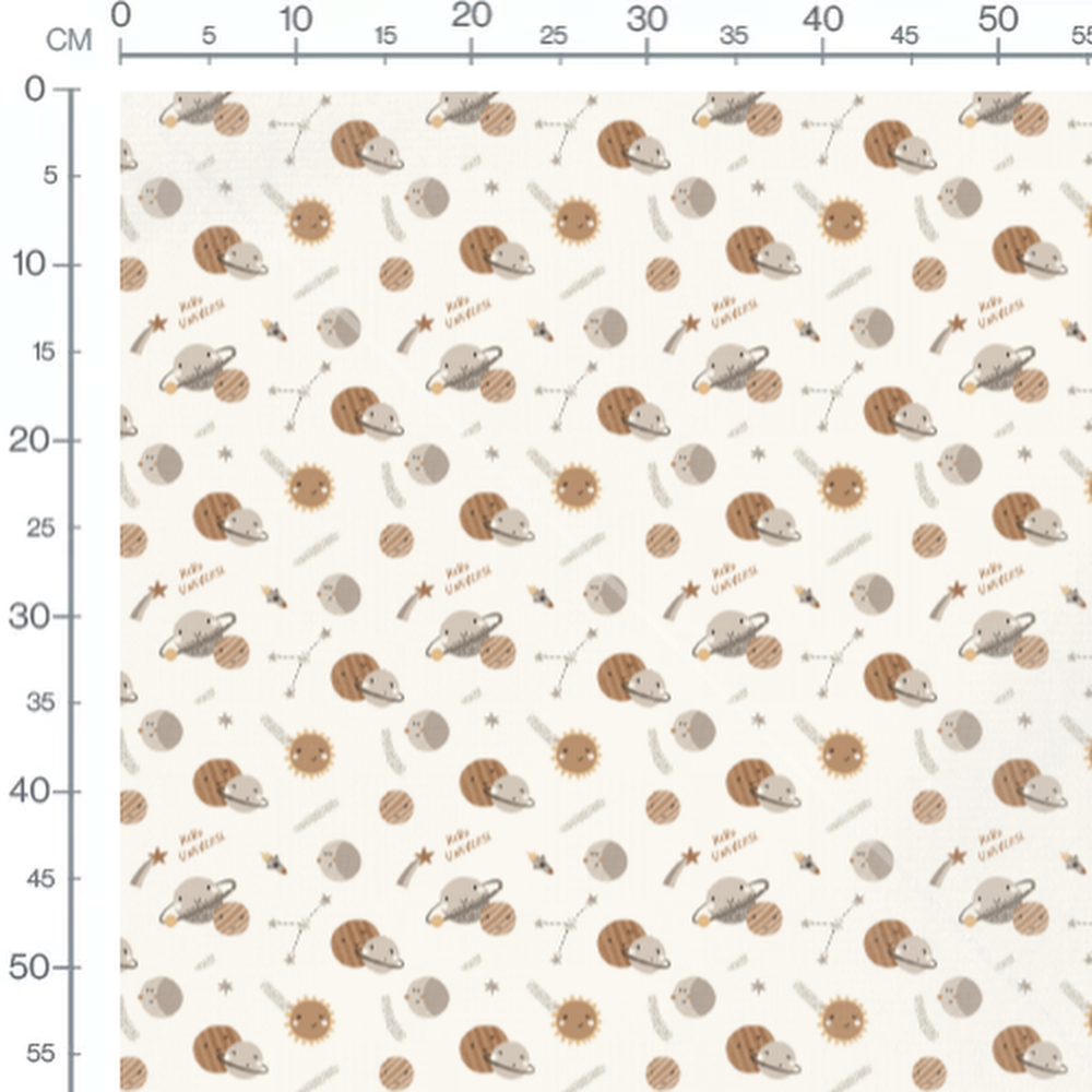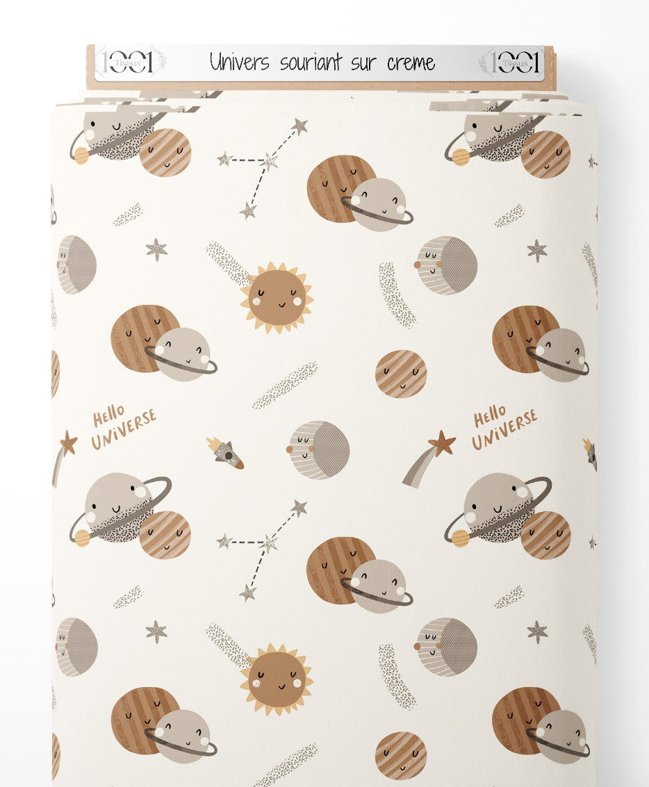 Soleil et planètes avec visages souriants en tons bruns et gris. Étoiles et constellations grises dispersées. Fusée et comète ajoutent une touche ludique.Les tissus