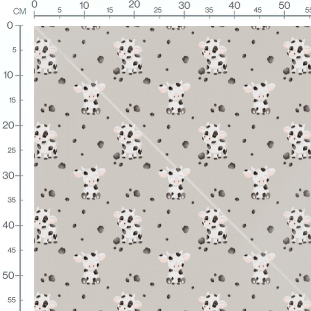 Les vaches ont des oreilles roses et des taches noires distinctes. Le fond gris met en valeur les motifs de vaches et de taches. Les taches noires varient en taille et sont réparties uniformément.Les tissus