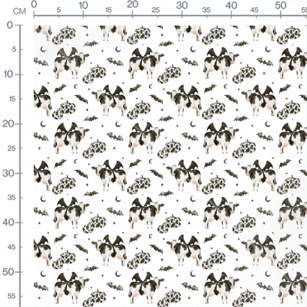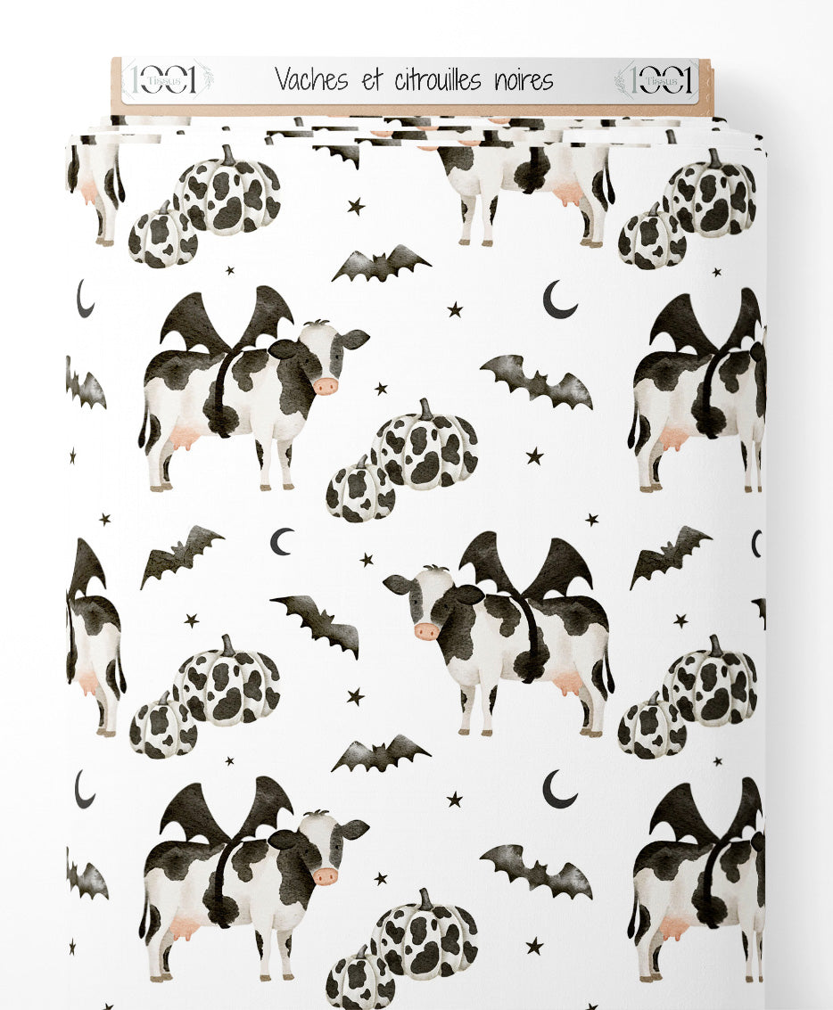 Des étoiles noires parsèment le fond blanc. Les vaches portent des ailes de chauve-souris. Les citrouilles sont décorées de motifs noirs et blancs.Les tissus