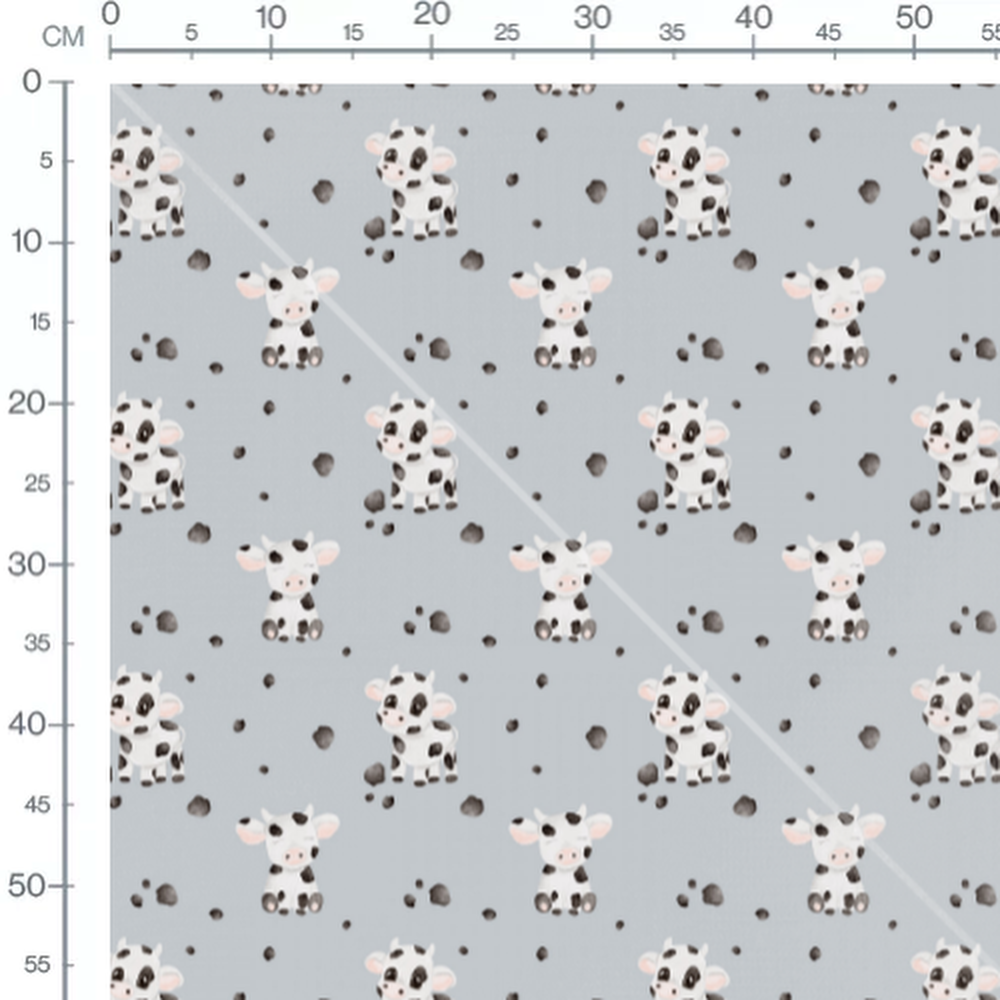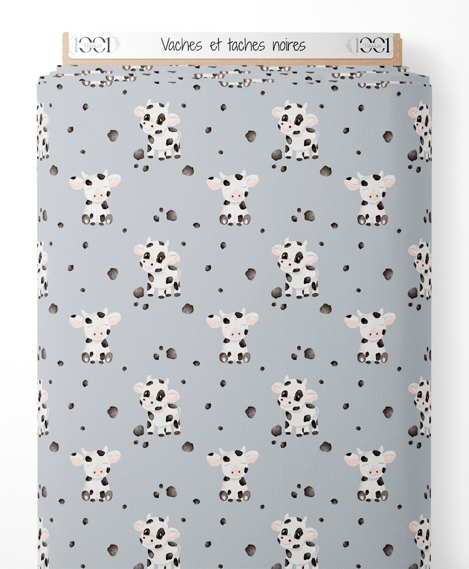 Les vaches ont des oreilles roses et des yeux noirs. Les taches noires varient en taille et sont réparties uniformément. Le fond gris est uniforme et doux.Les tissus