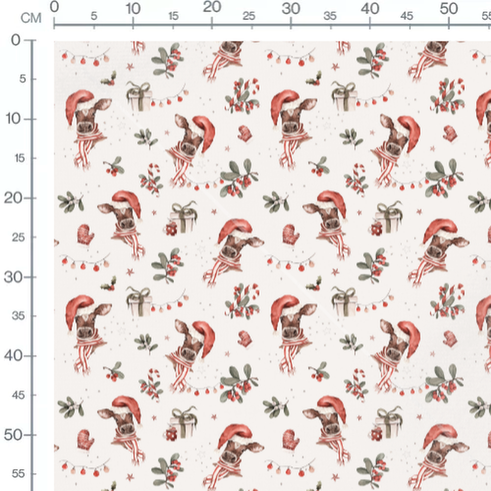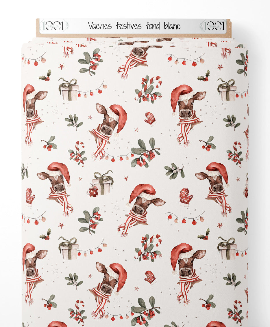 Guirlandes lumineuses et bonnets rouges complètent le motif. Feuilles vertes et baies rouges ajoutent une touche festive. Petits motifs de gants et cannes à sucre décorent l'ensemble.Les tissus