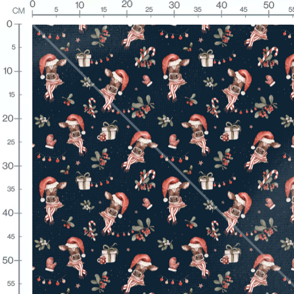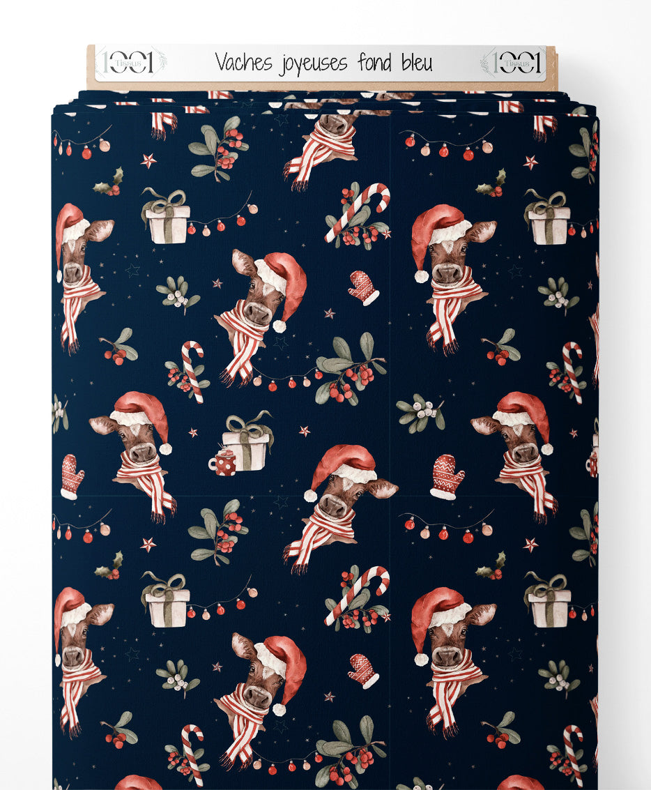 Les vaches portent des écharpes rayées rouges et blanches. Des guirlandes lumineuses et des étoiles complètent le motif festif.Les tissus