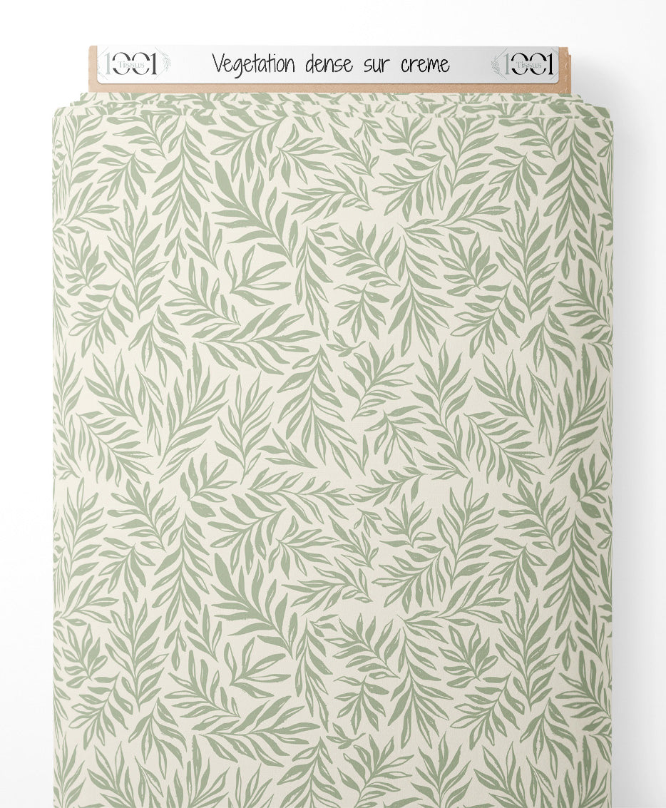 Les feuilles sont de différentes formes et tailles, créant un motif harmonieux. Le fond crème met en valeur les nuances de vert des feuilles. Ce motif apporte une touche naturelle et apaisante.Les tissus