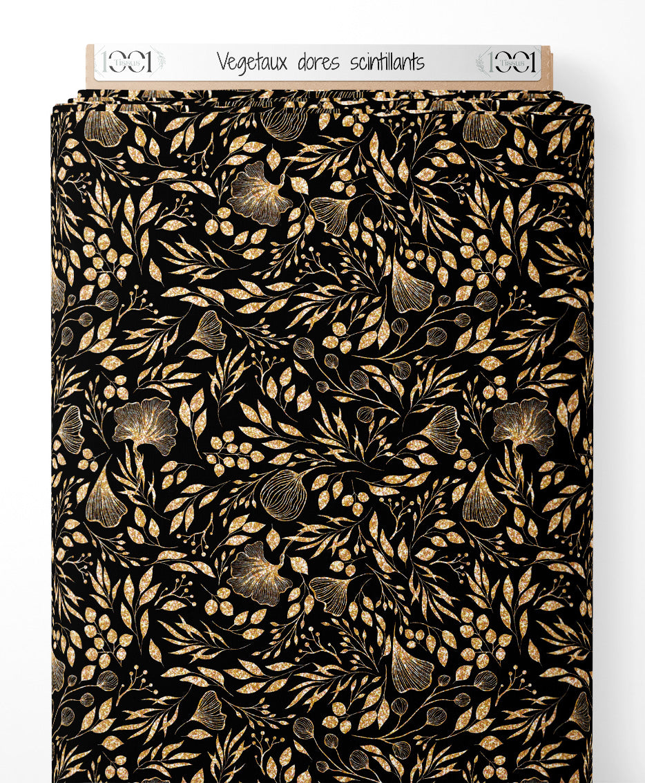 Les feuilles sont accompagnées de fleurs aux contours dorés. Des baies dorées complètent le motif végétal. Les détails dorés ajoutent une touche scintillante au design.Les tissus