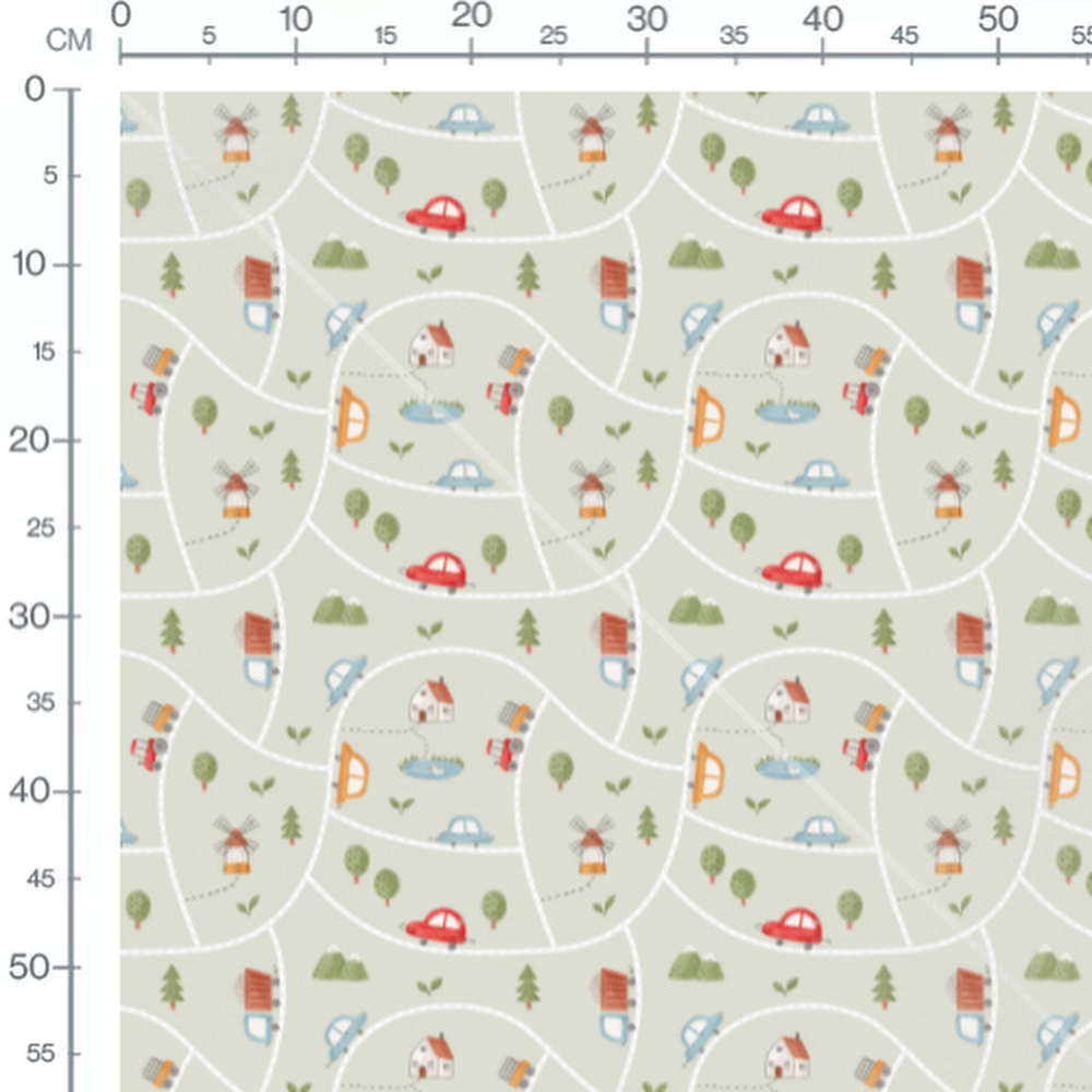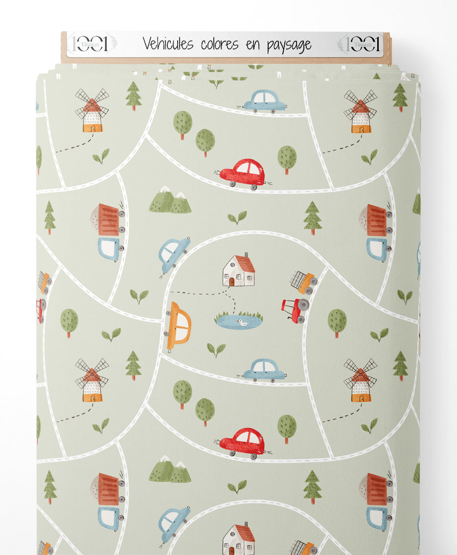 Un moulin à vent et un étang avec un canard complètent le paysage. Des montagnes vertes et des arbres variés ajoutent de la diversité. Les routes sinueuses créent un réseau complexe sur le fond beige.Les tissus