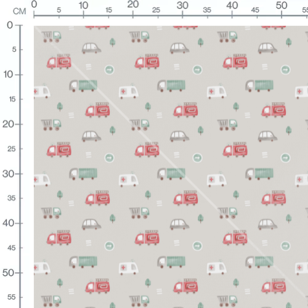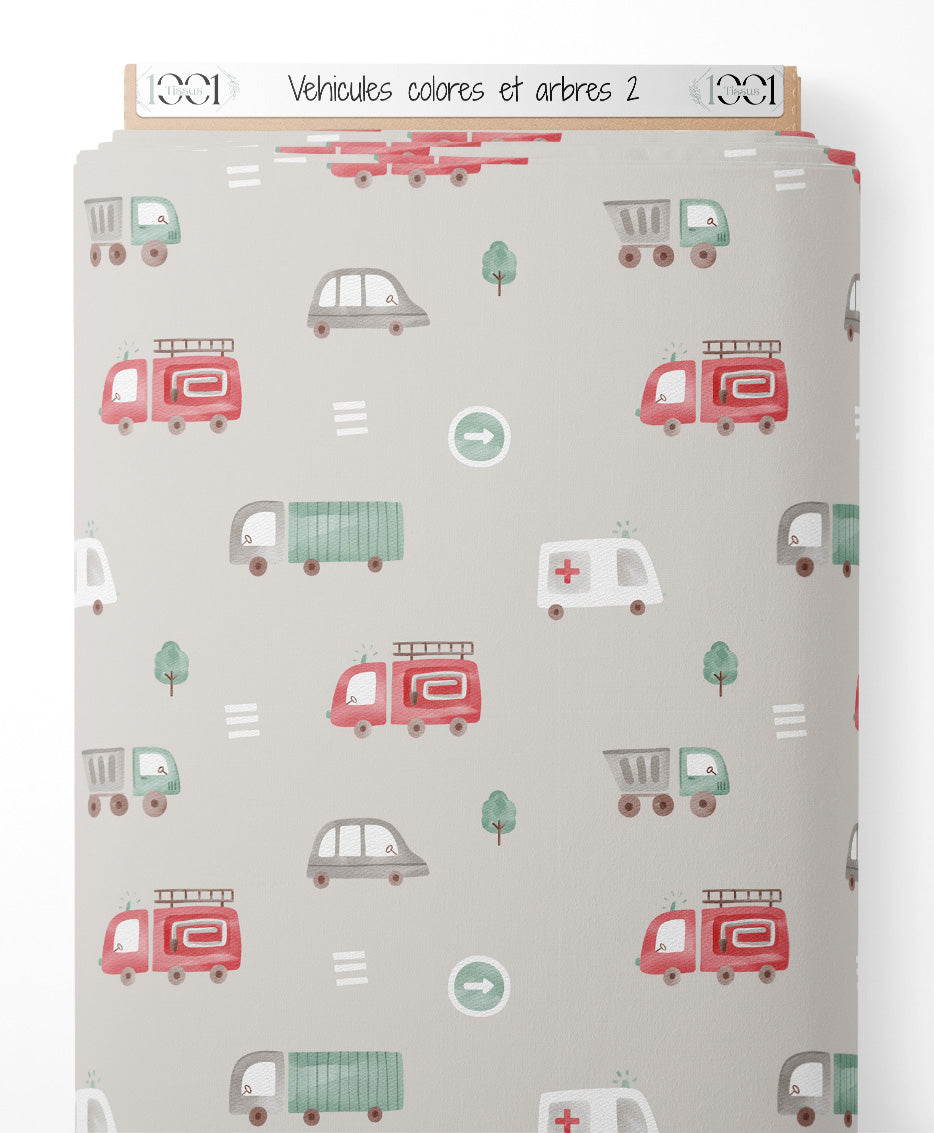 Les véhicules incluent des camions, des voitures et des ambulances. Les arbres sont dispersés entre les véhicules. Des symboles de direction et des lignes blanches ajoutent des détails au motif.Les tissus