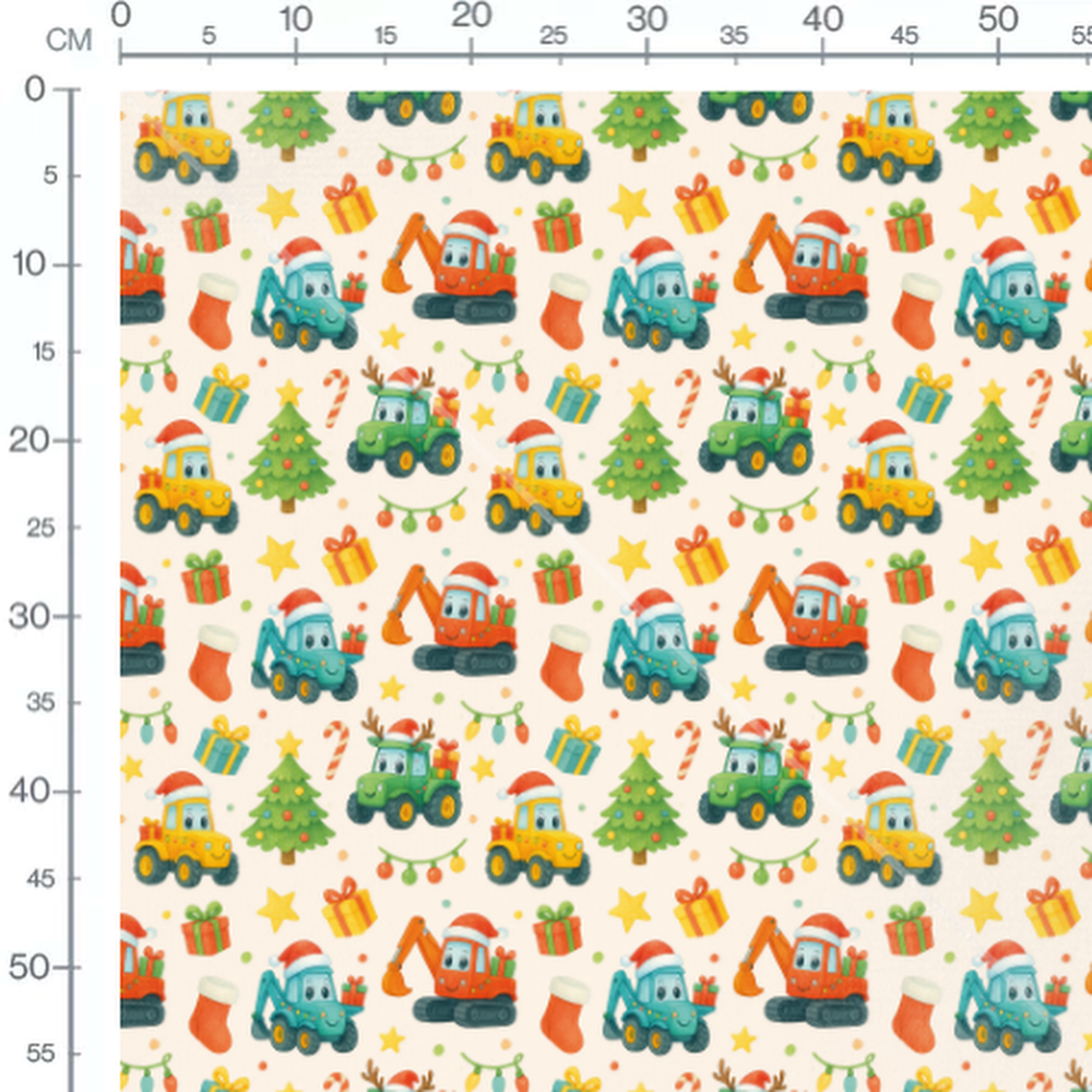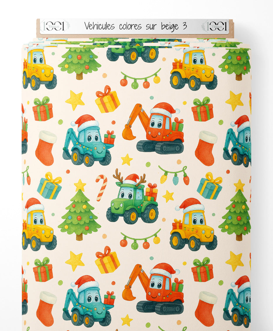 Les véhicules incluent des camions et des pelleteuses avec des chapeaux de Noël rouges. Des cadeaux colorés, des sapins verts et des guirlandes lumineuses ajoutent une touche festive. Des étoiles jaunes et des cannes à sucre rouges et blanches complètent le motif. Des chaussettes rouges et des rennes décorent également le fond.Les tissus
