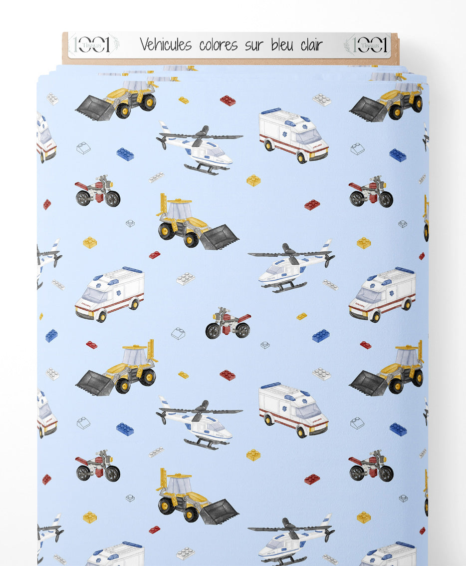 Tissu - Véhicules colorés sur bleu clair