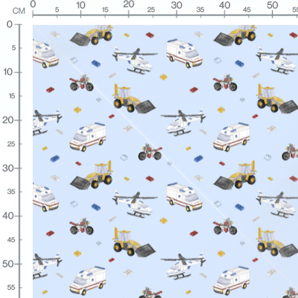 Les hélicoptères sont blancs avec des détails noirs. Les ambulances sont blanches avec des bandes rouges et bleues. Les motos sont rouges avec des roues noires. Des briques de construction rouges, jaunes, bleues et blanches sont dispersées.Les tissus
