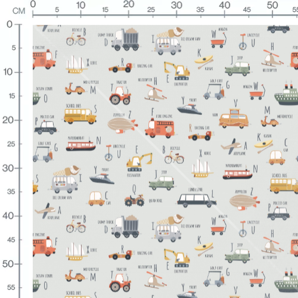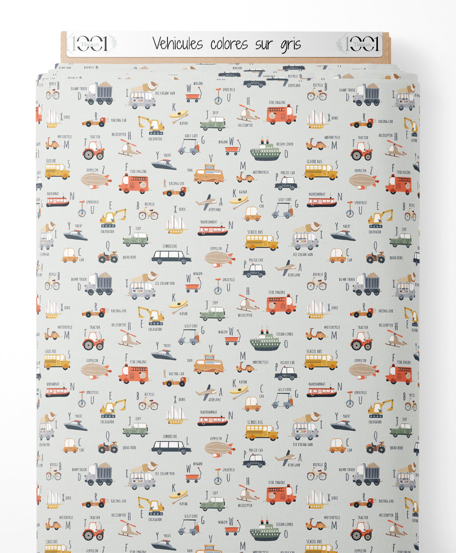 Les véhicules incluent des voitures, des camions, des bateaux et des avions. Chaque véhicule est accompagné d'une lettre de l'alphabet. Les couleurs des véhicules incluent le rouge, le bleu, le jaune et le gris.Les tissus