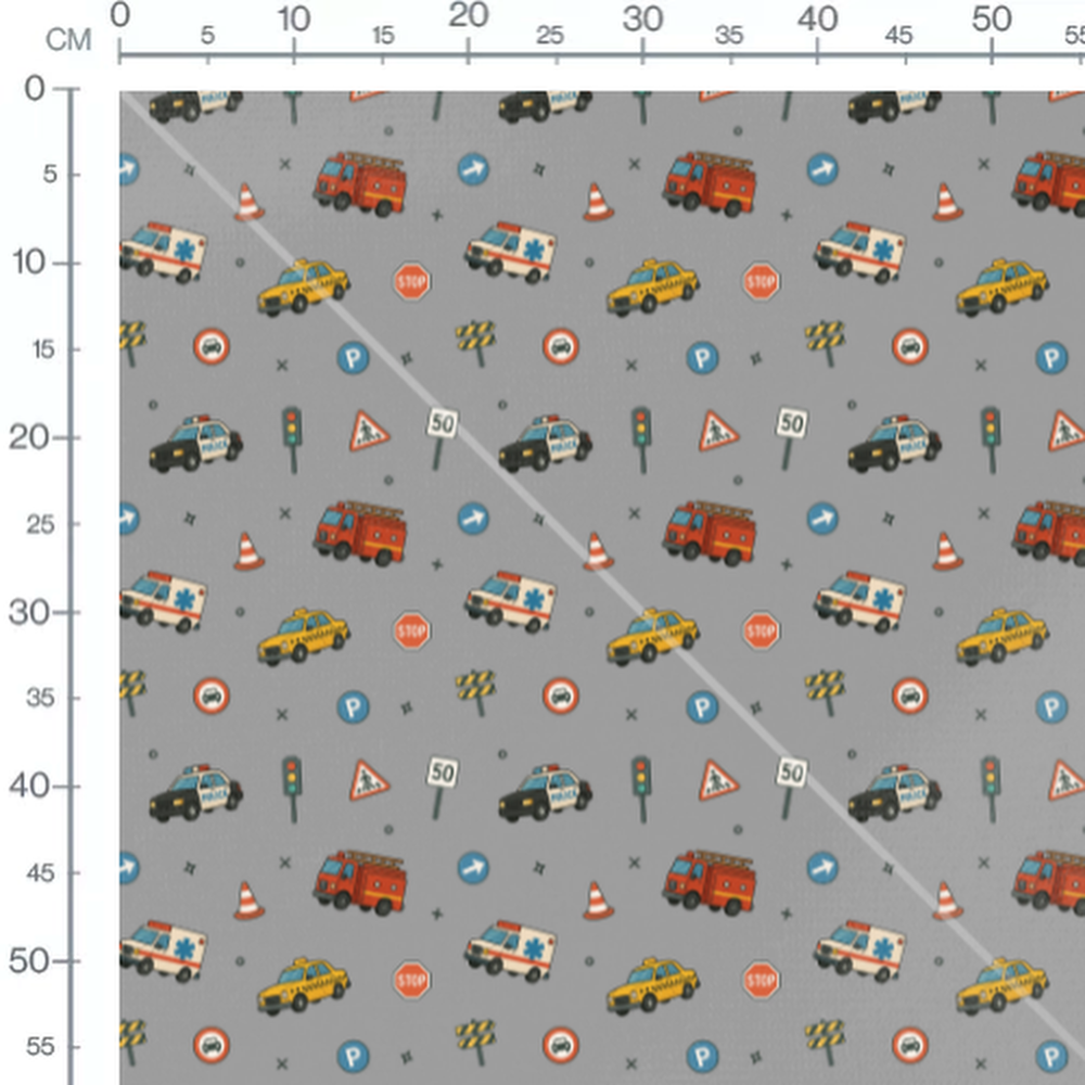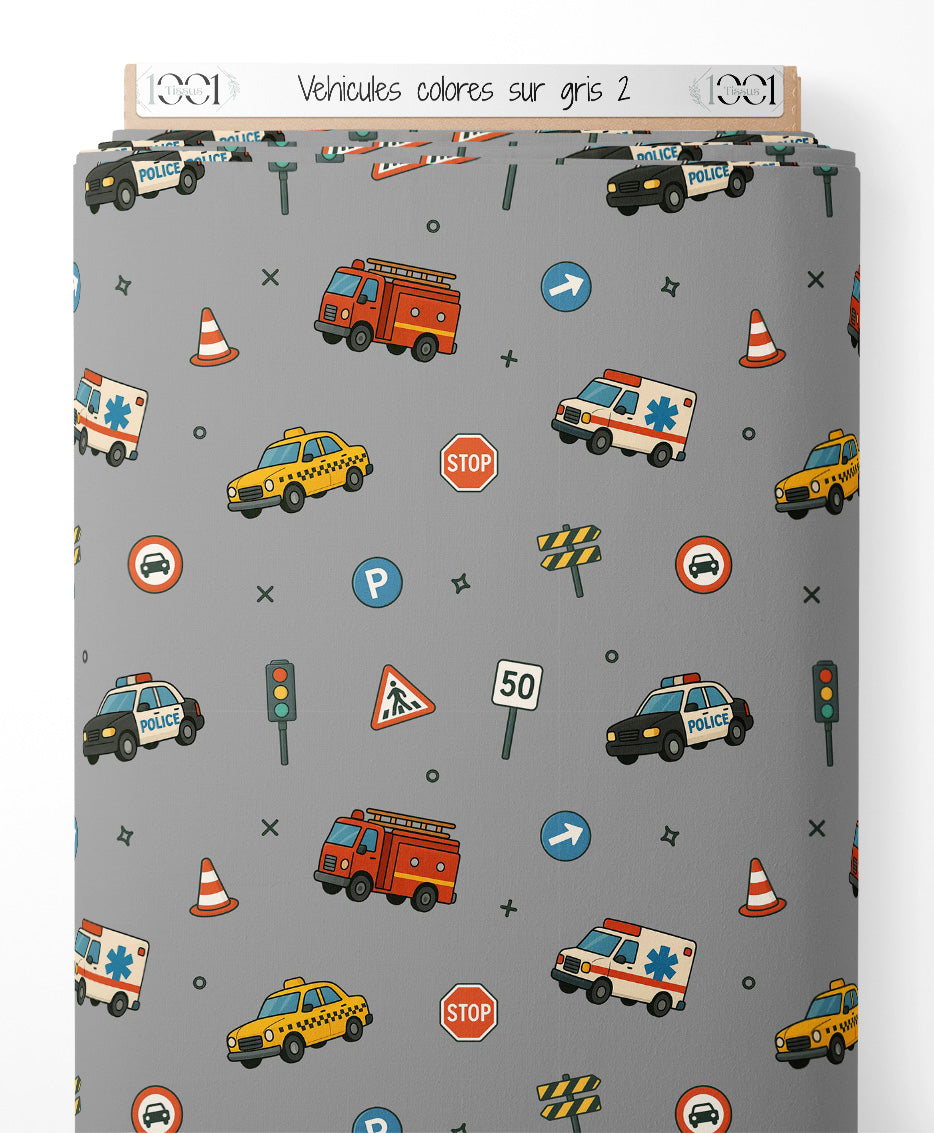 Tissu - Véhicules colorés sur gris 2