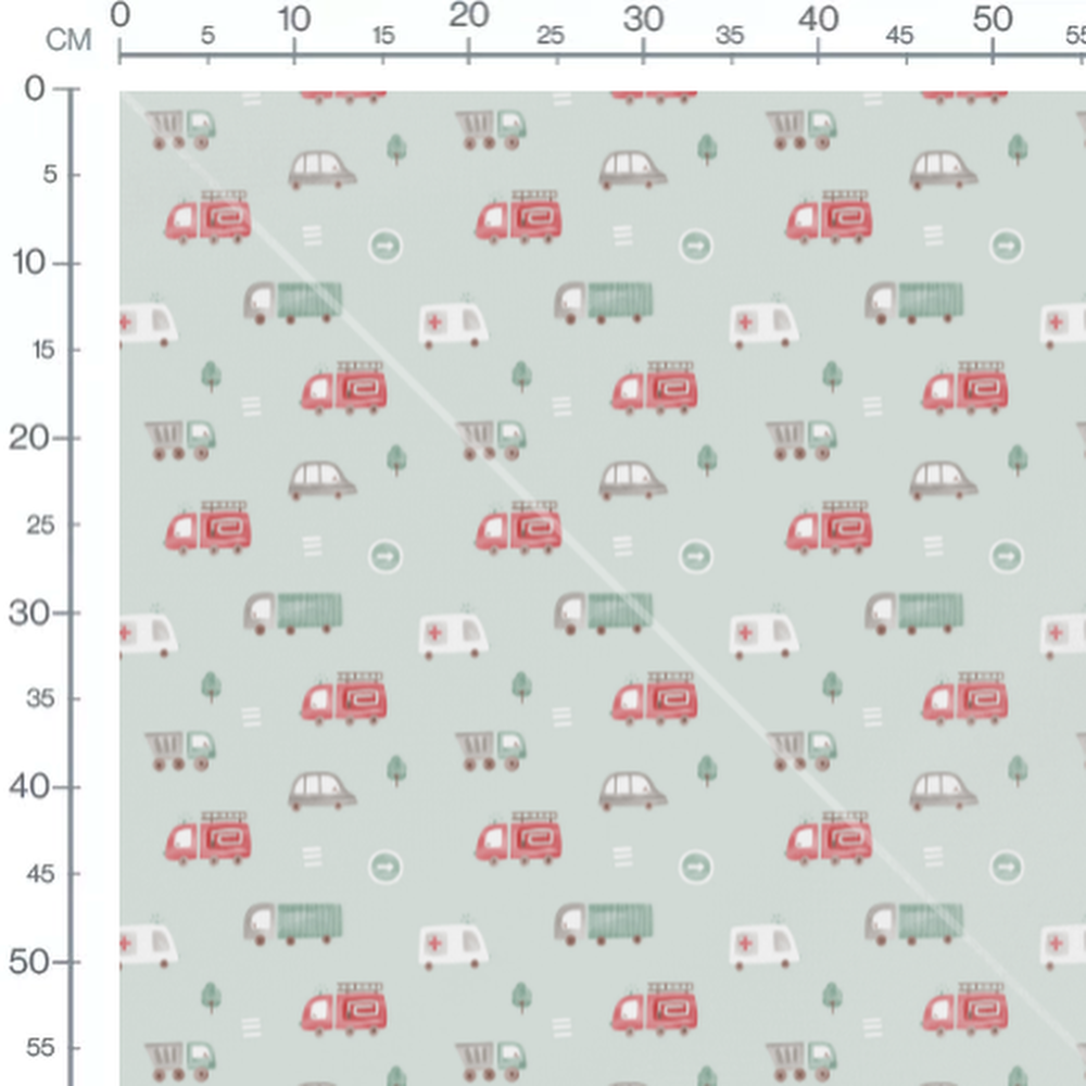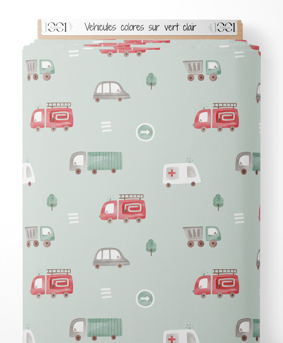Les véhicules incluent un camion, une voiture, une ambulance et un camion de pompiers. Les couleurs principales sont le rouge, le gris et le vert. De petits arbres verts et des symboles blancs complètent le motif.Les tissus