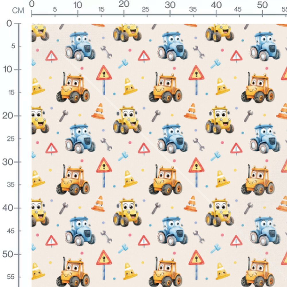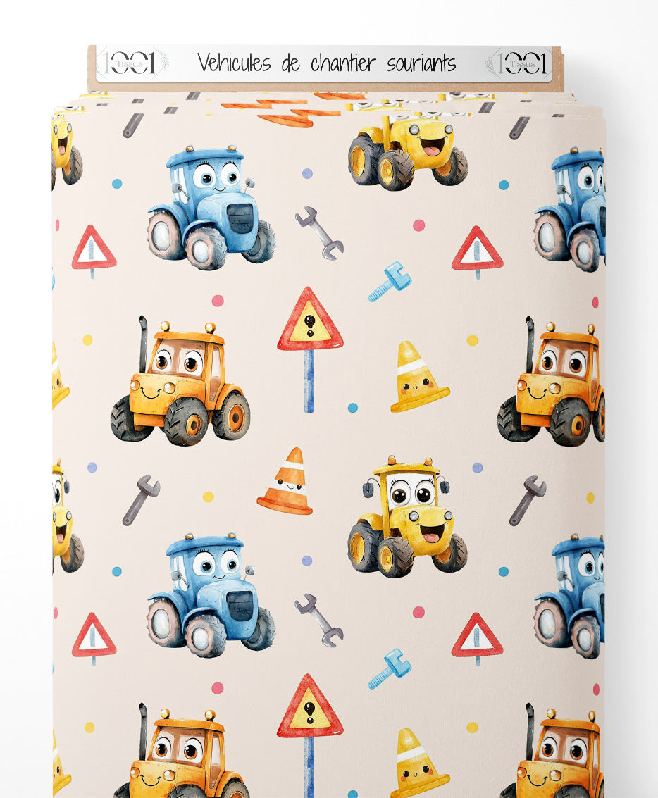 Tracteurs bleus et orange avec visages souriants. Cônes de signalisation jaunes et panneaux rouges. Clés et écrous gris et bleus parmi des points colorés.Les tissus