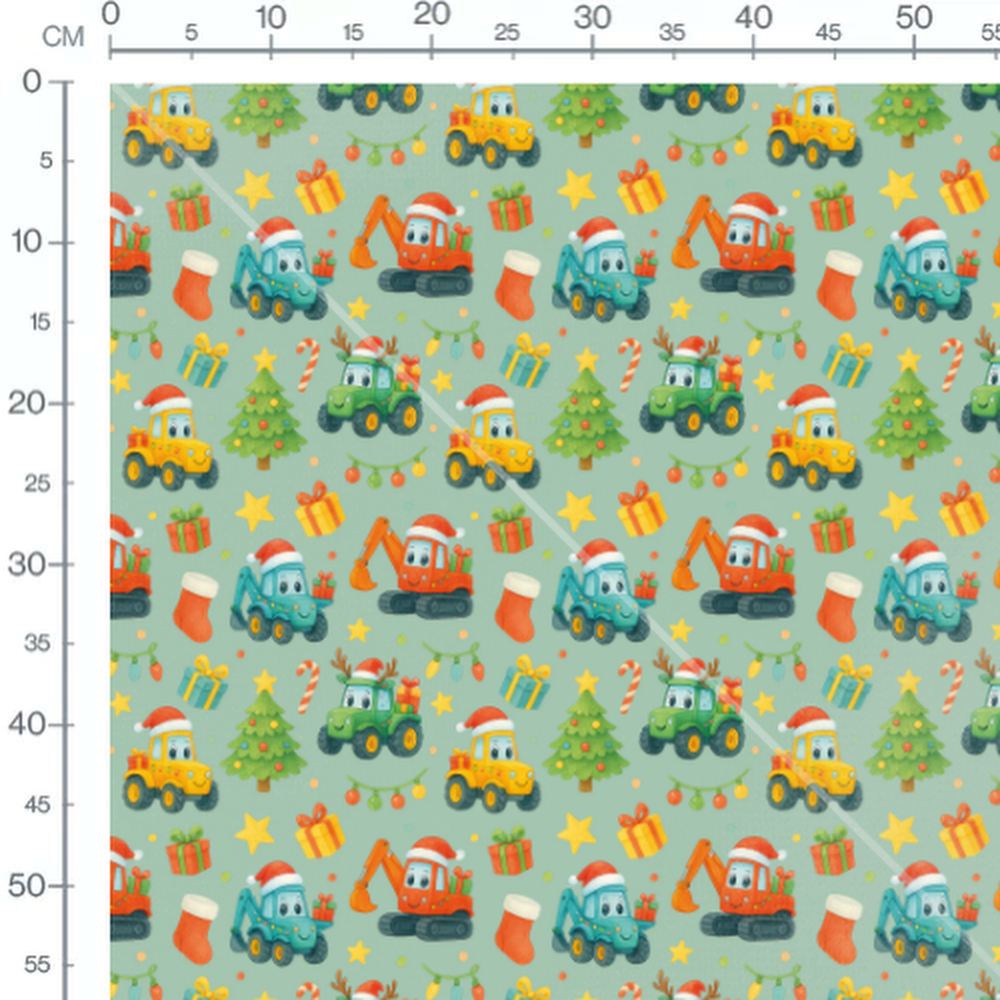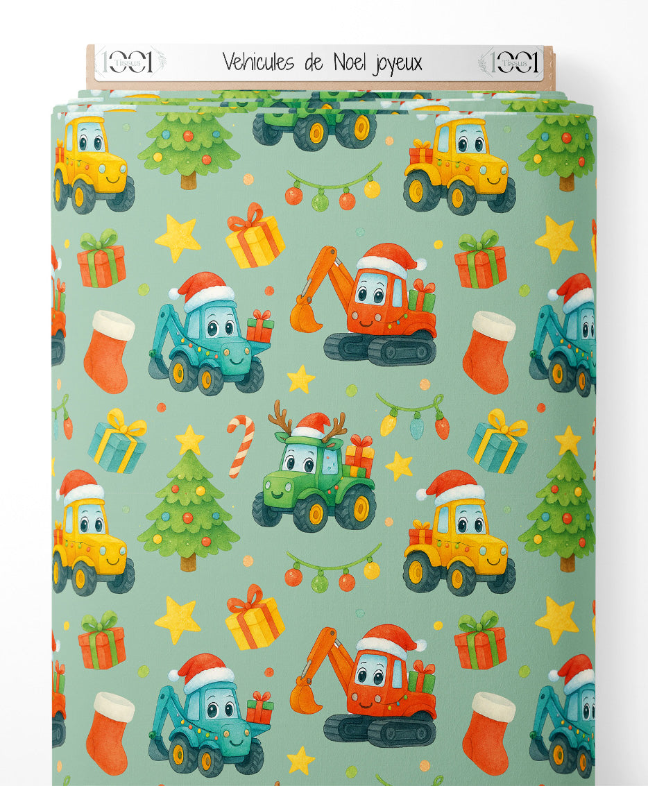 Les véhicules incluent des camions et des pelleteuses avec des expressions joyeuses. Des guirlandes lumineuses et des cannes en sucre ajoutent une touche festive. Des chaussettes rouges et des rennes complètent le thème de Noël.Les tissus