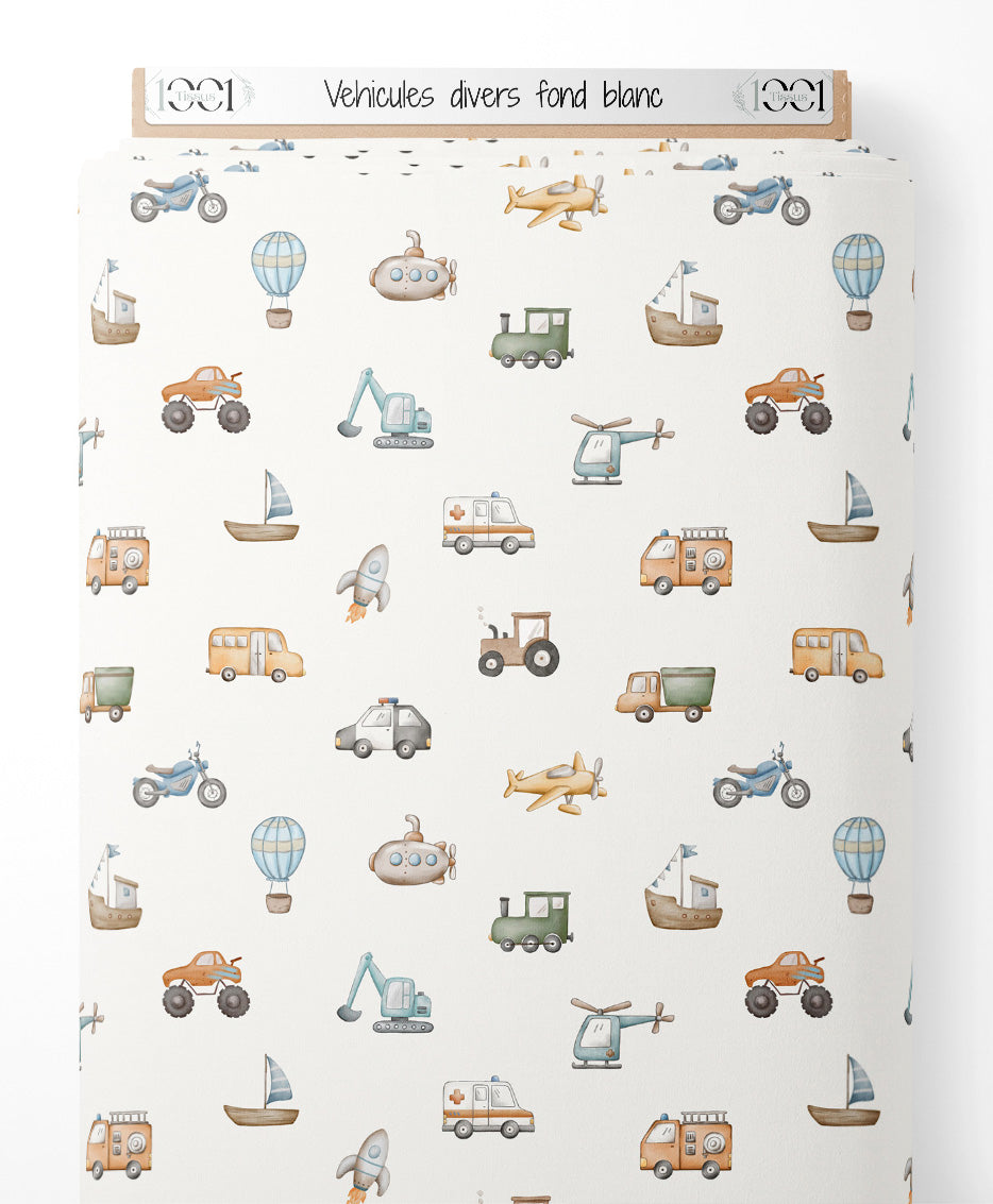 Tissu - Véhicules divers sur fond blanc