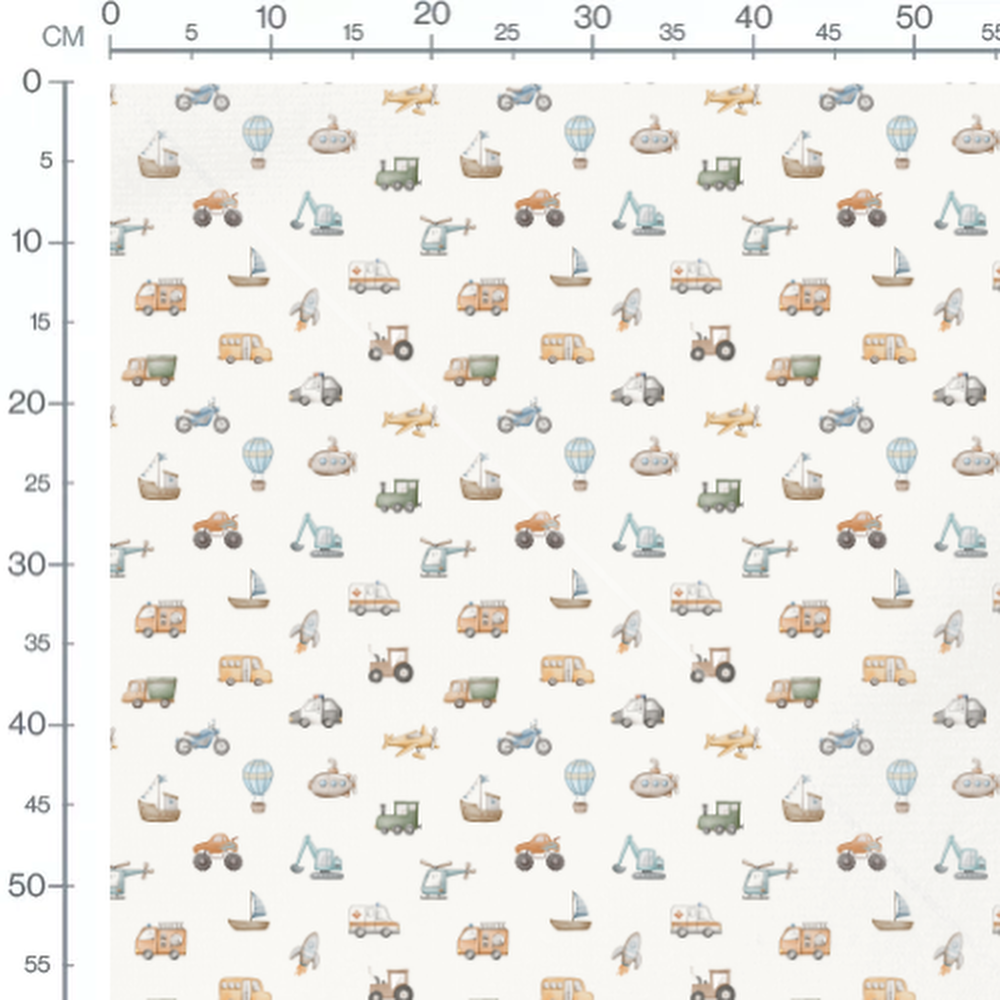 Motifs de véhicules incluant voitures, bateaux, et avions. Illustrations de montgolfières et fusées en nuances douces. Présence de véhicules de construction et de secours.Les tissus