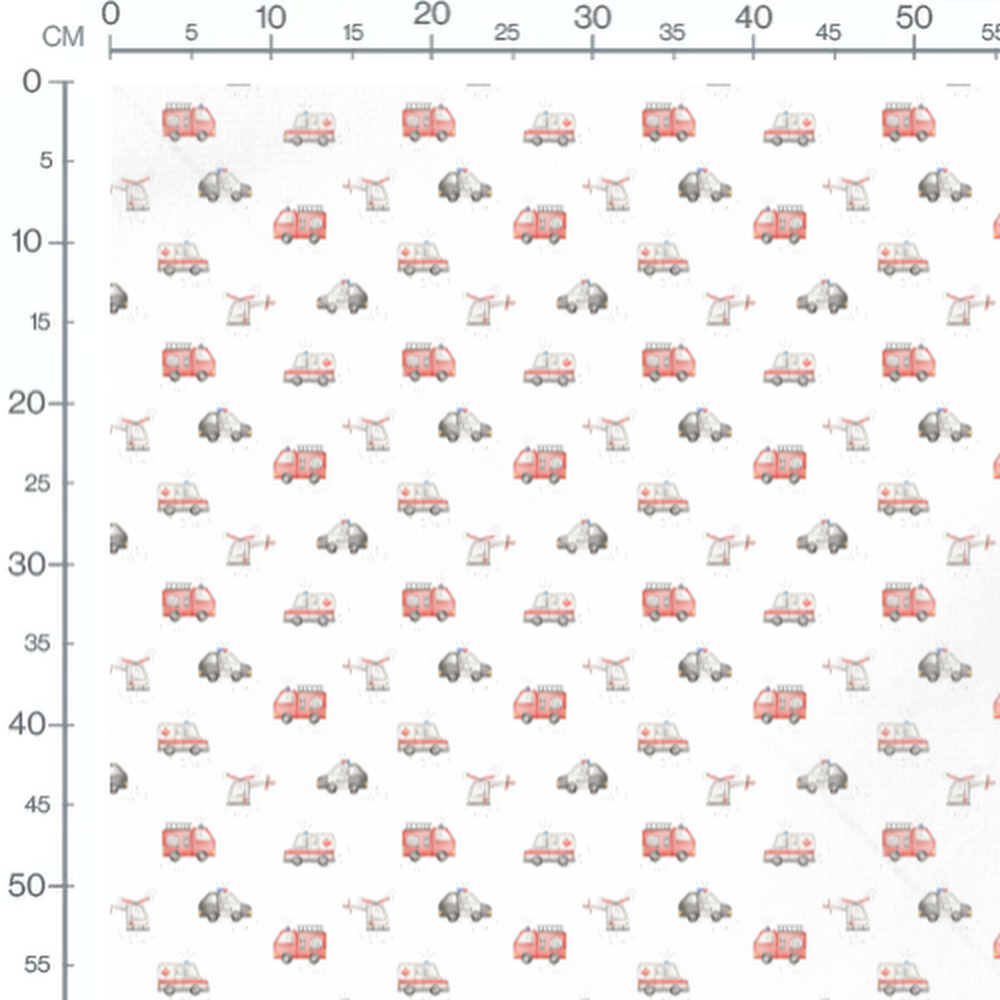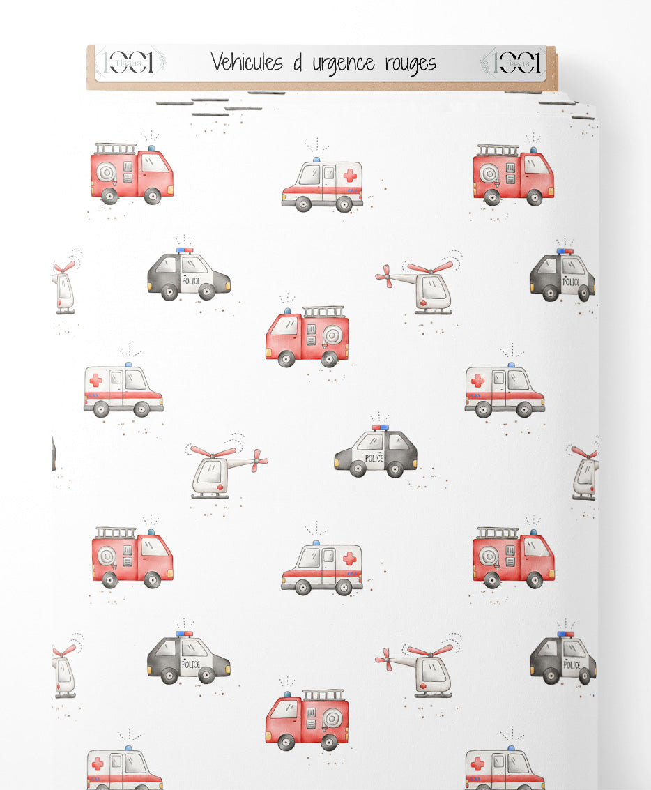 Hélicoptères avec hélices rouges et ambulances avec croix rouges. Camions de pompiers avec échelles et voitures de police avec sirènes bleues.Les tissus