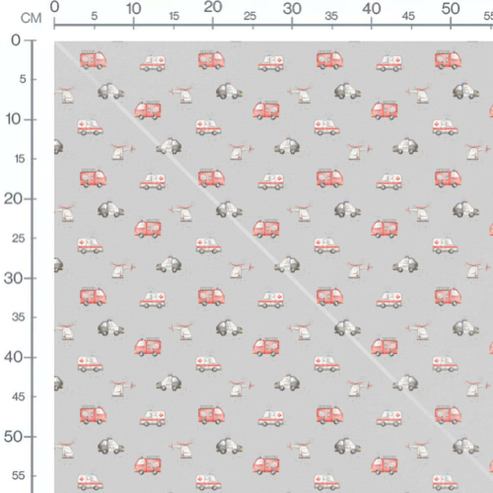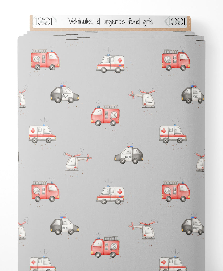 Les véhicules incluent des ambulances blanches avec des croix rouges. Les voitures de police sont noires et blanches avec des sirènes bleues. Les camions de pompiers sont rouges avec des échelles grises.Les tissus