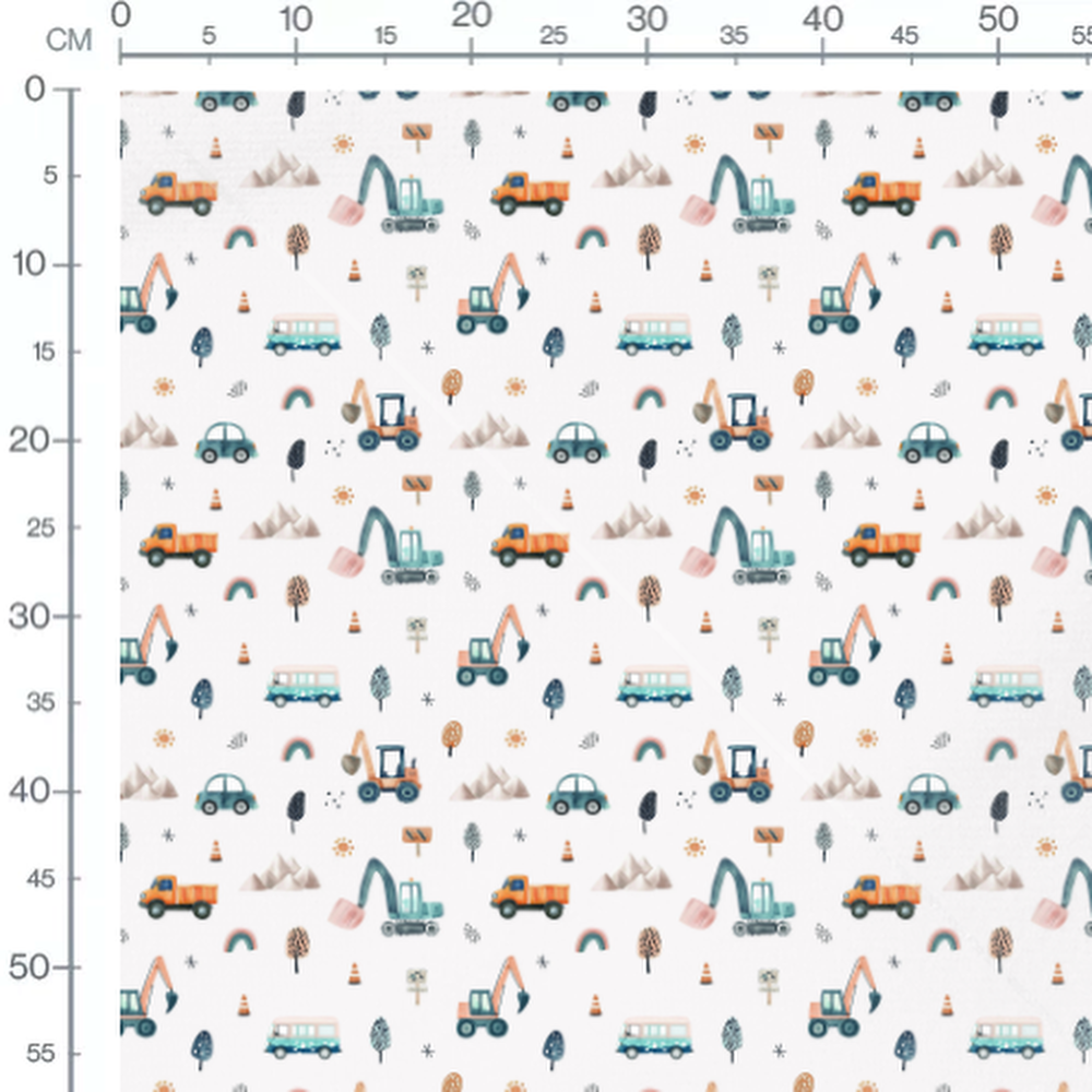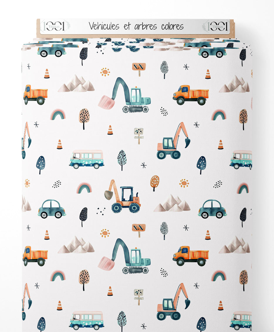 Camions, pelleteuses et voitures en bleu, orange et rose. Arbres stylisés en noir et blanc. Montagnes et arcs-en-ciel en tons doux.Les tissus