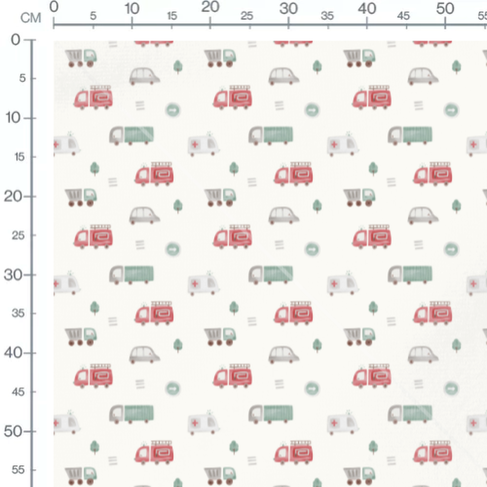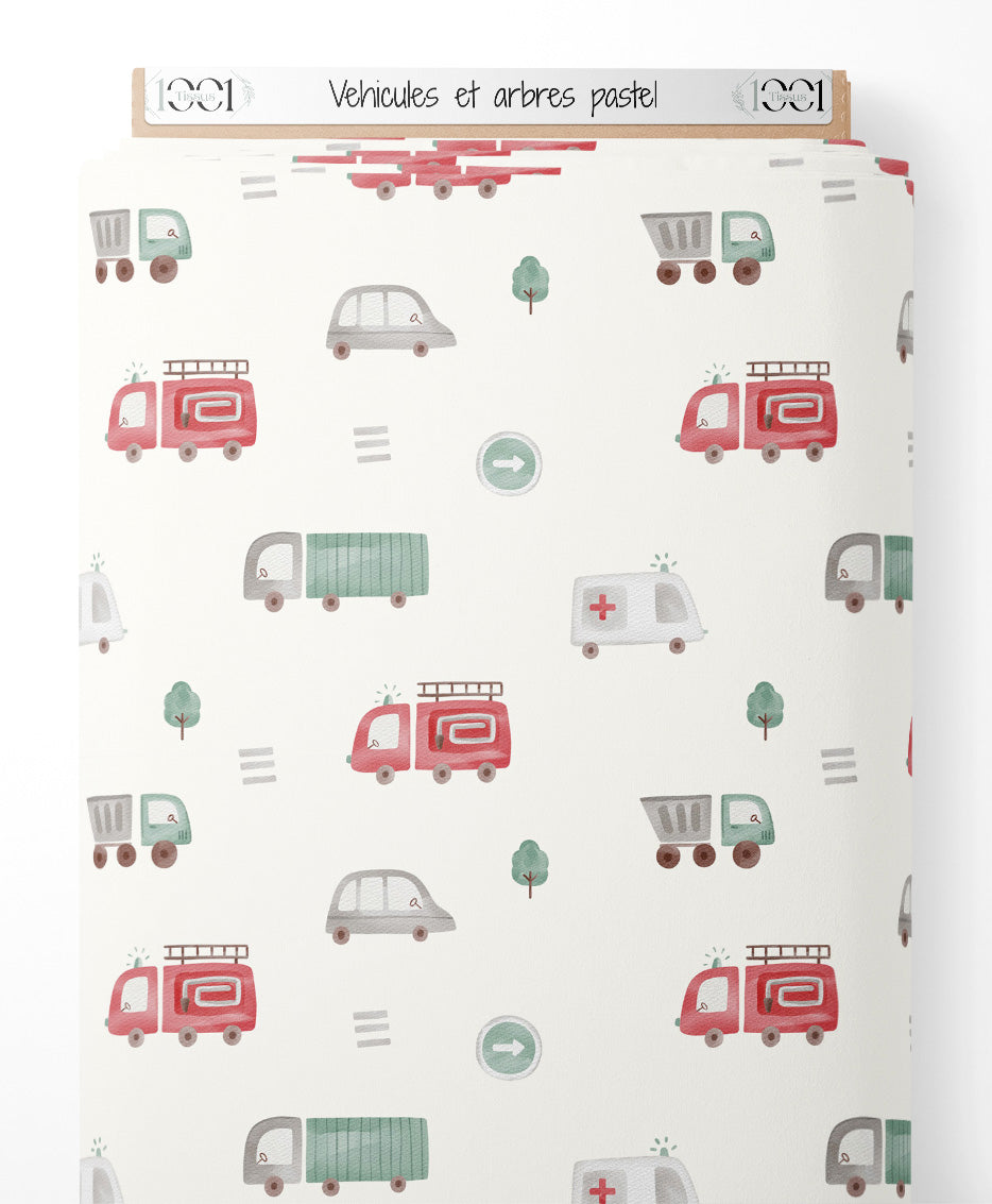 Les véhicules incluent des camions de pompiers rouges et des ambulances blanches. Les voitures sont grises et vertes, accompagnées de petits arbres verts. Des panneaux de signalisation ajoutent des détails au motif.Les tissus