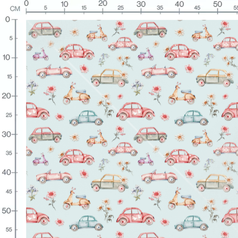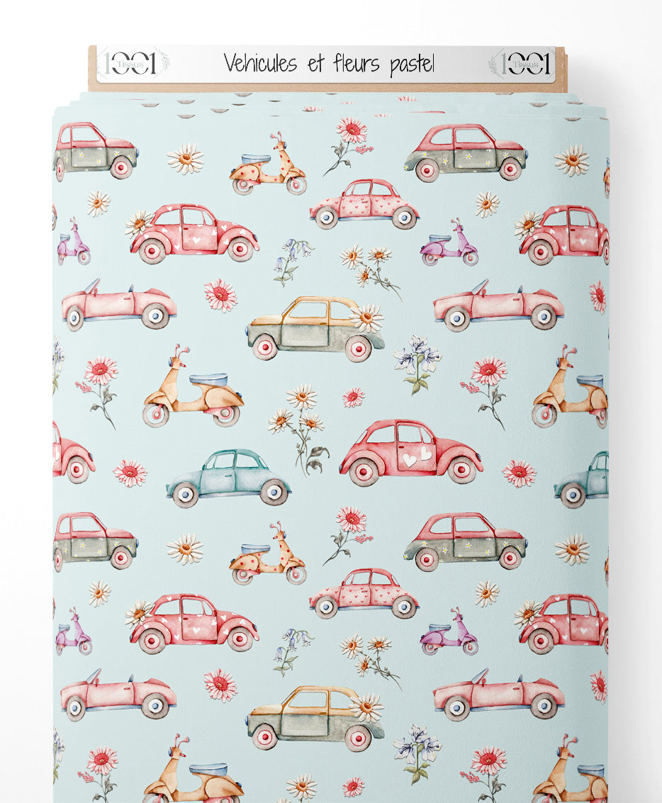 Les voitures sont de différentes teintes pastel, incluant le rose, le vert et le beige. Les scooters ajoutent une touche ludique avec leurs couleurs vives. Les fleurs, délicatement dessinées, apportent une ambiance douce et printanière.Les tissus