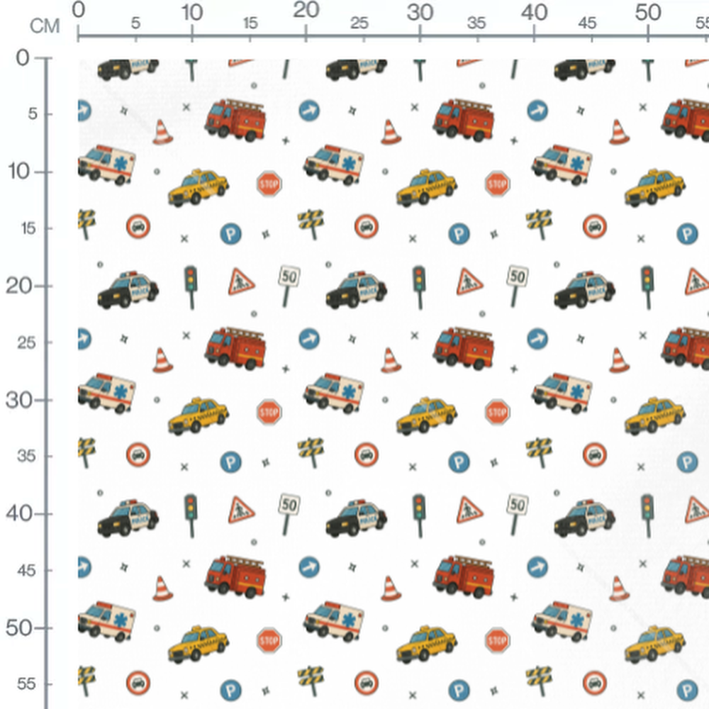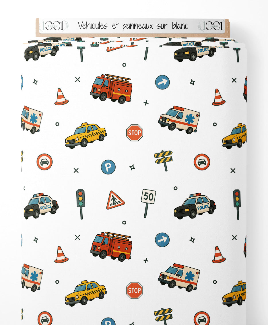 Tissu - Véhicules et panneaux sur blanc