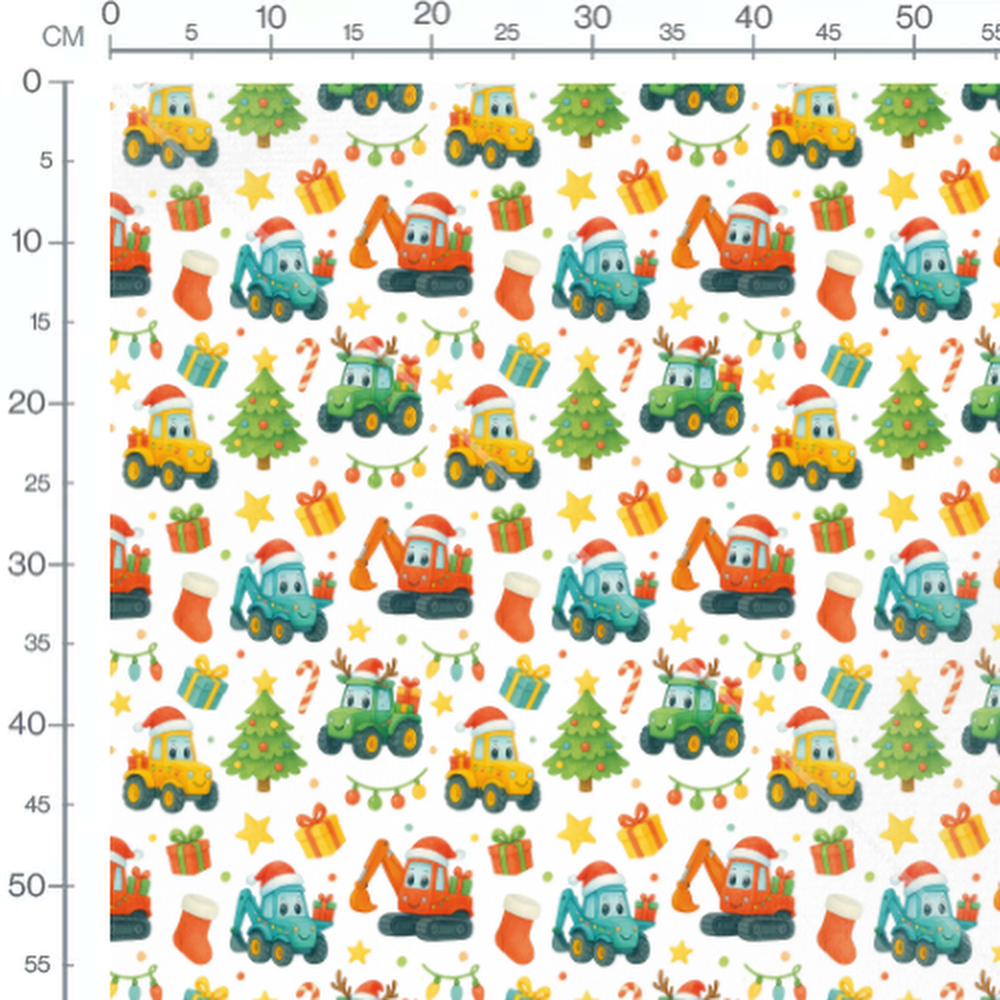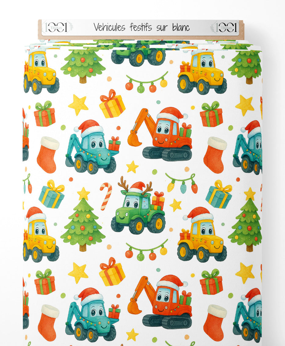 Les véhicules incluent des camions et des pelleteuses avec des chapeaux de Noël. Des cadeaux colorés et des sapins verts complètent le motif. Des décorations de Noël comme des guirlandes et des étoiles jaunes sont dispersées. Des cannes en sucre et des chaussettes rouges ajoutent une touche festive.Les tissus